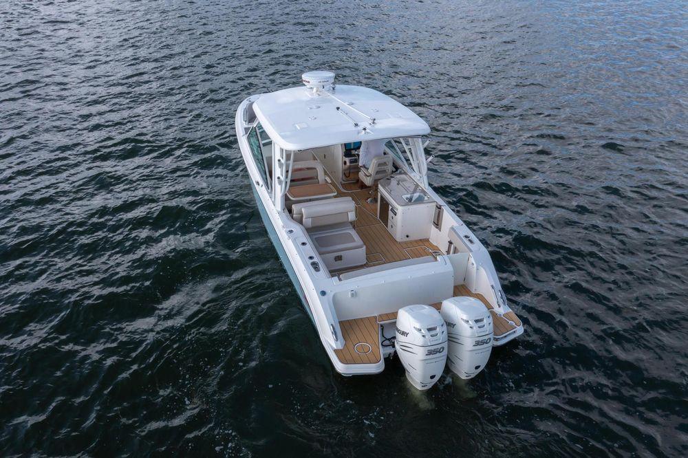 - A cockpit utility center includes a sink, 18-gallon cooler and prep surface, plus optional grill and fridge.