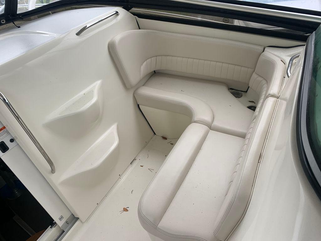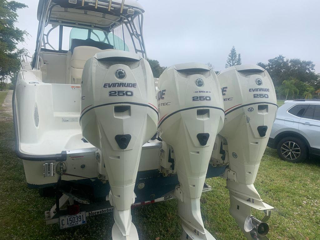 The interior sports a mid cabin w/ stand up head and shower. Powered by triple Evinrude E-Tecs @ 250hp each.