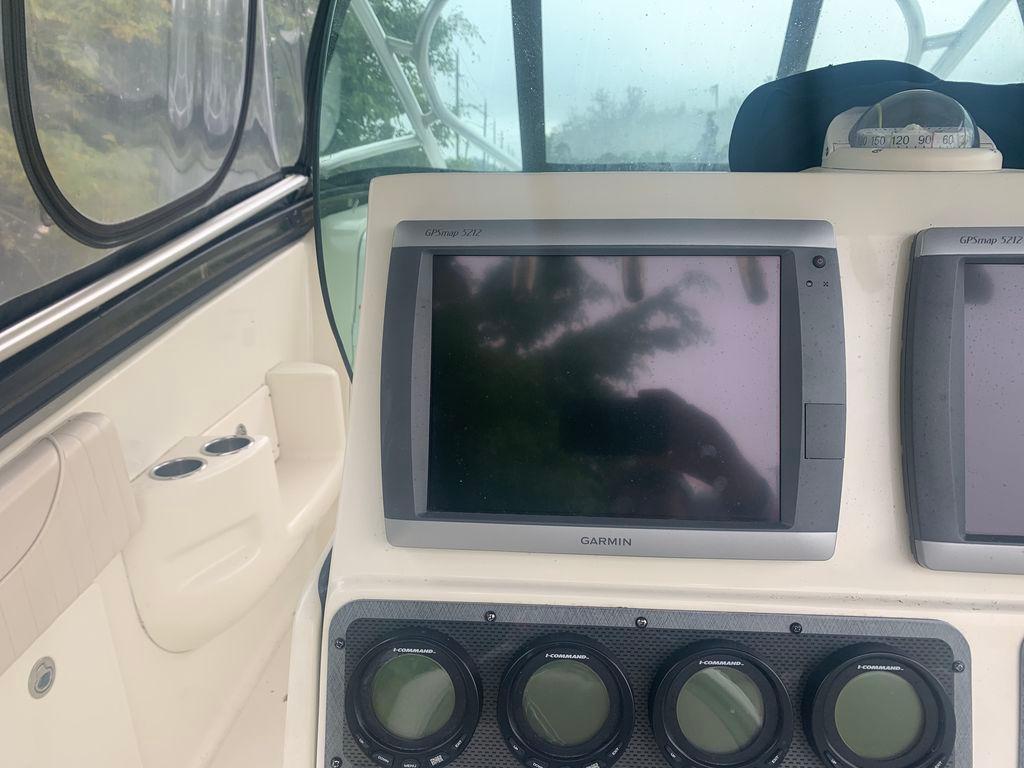 The interior sports a mid cabin w/ stand up head and shower. Powered by triple Evinrude E-Tecs @ 250hp each.