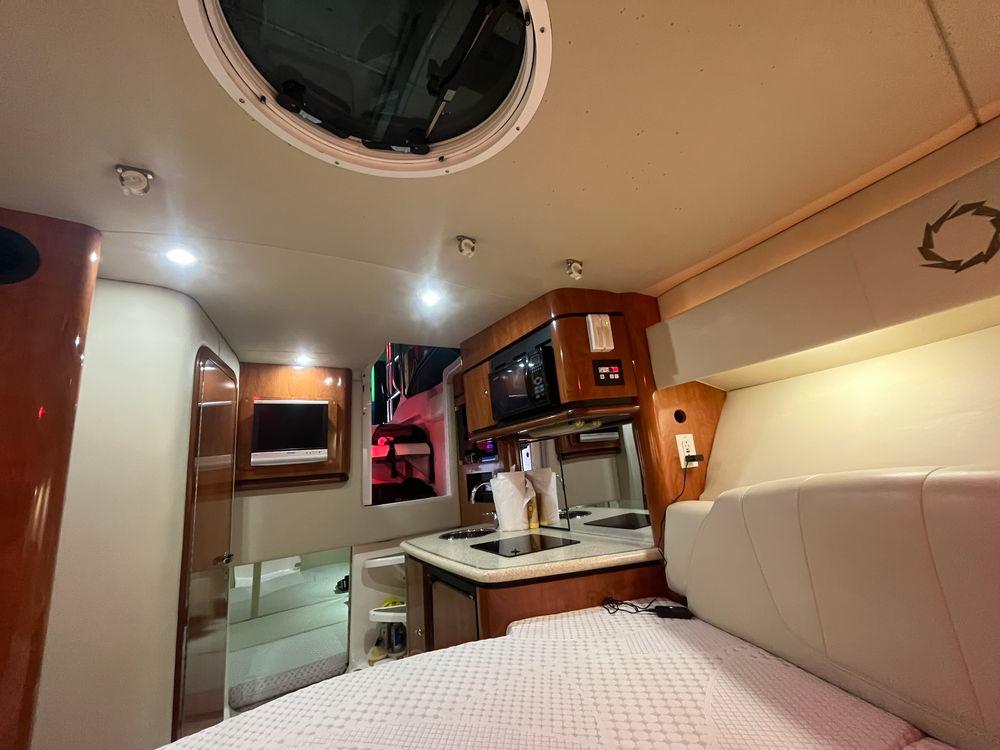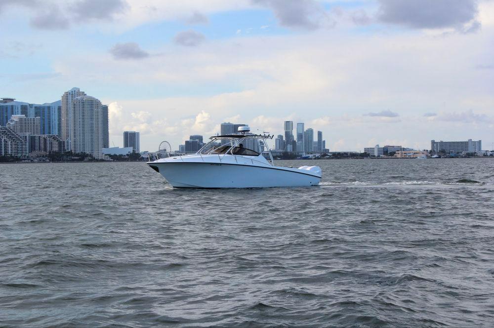 Take command of the Fountain 33 SFC with its center helm console, which provides a great view of your course, your wake, your cockpit, and your crew. The 33 SFC cockpit is arranged for serious fishing with lockable under-gunwale rod stowage able to stow a pair of 50s per side. The transom livewell is also smart, the lid has a small hatch to keep water from sloshing out, but the lid can also be removed entirely if you want to use the livewell as a fishbox if needed. There are also two massive, macerated fish that boxes reside in the sole. A rigging station is on the transom and at the cockpit’s forward end is another livewell and a tackle storage unit. These modules are the perfect height for crew to sit on and watch strikes.