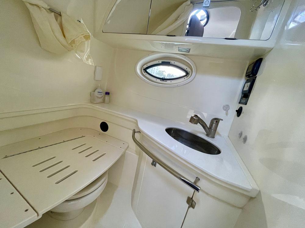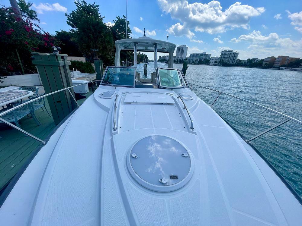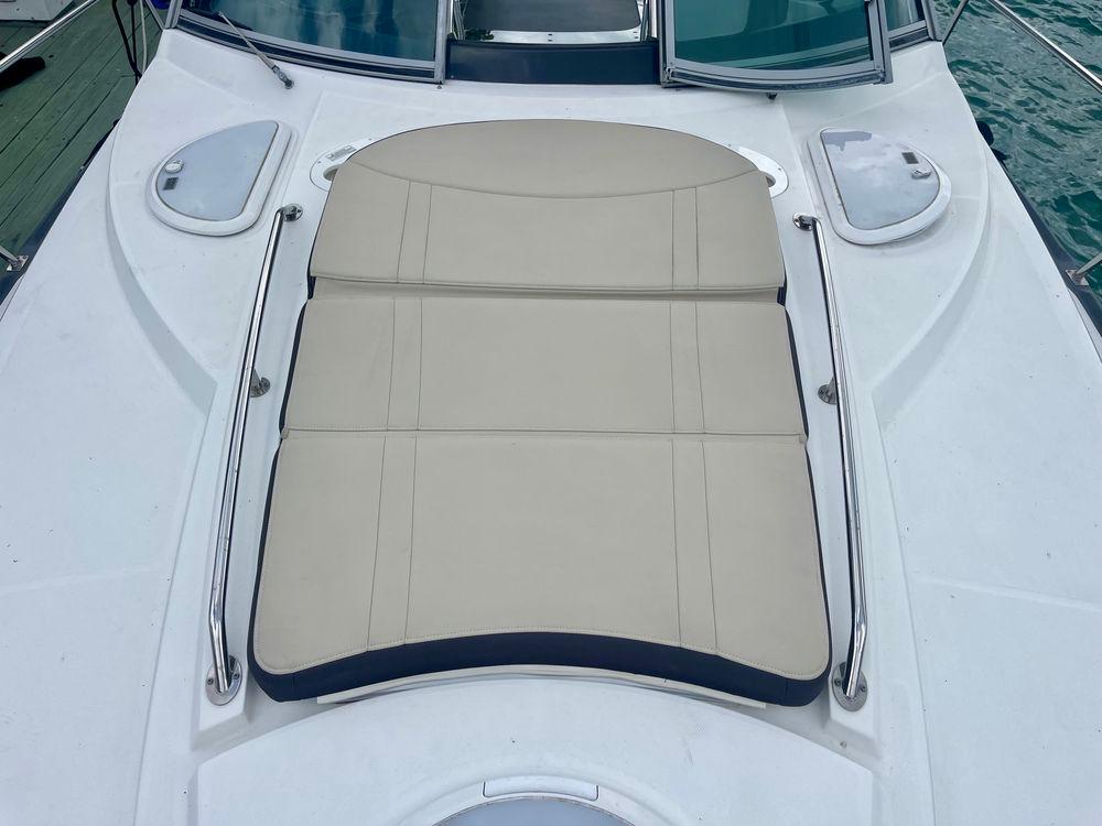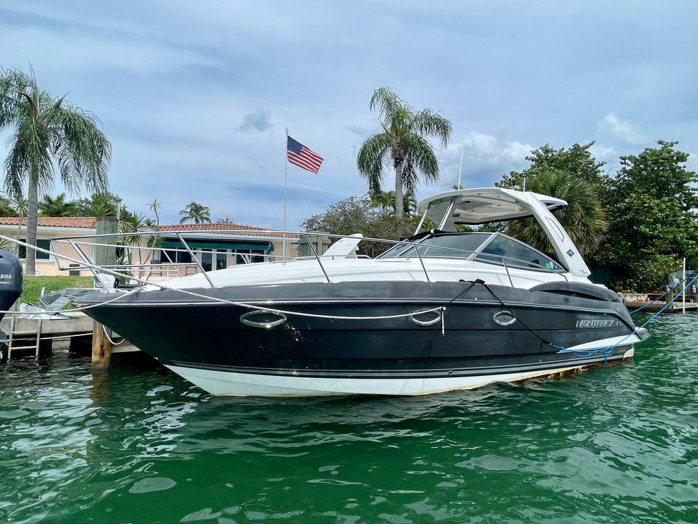 The Monterey’s well-appointed interior with Ultraleather upholstery has sleeping arrangements for six including a double berth forward, convertible dinette, and an aft seating area that converts to a double berth. Additional features include synthetic wood cabin flooring, an entertainment center with a 22" flat-screen TV, a generator, mahogany interior cabinetry, a cockpit wet bar, a transom shower, and a cockpit table. She has twin Volvo Penta 300HP engines that cruise at 26–28 knots (40+ wide open).