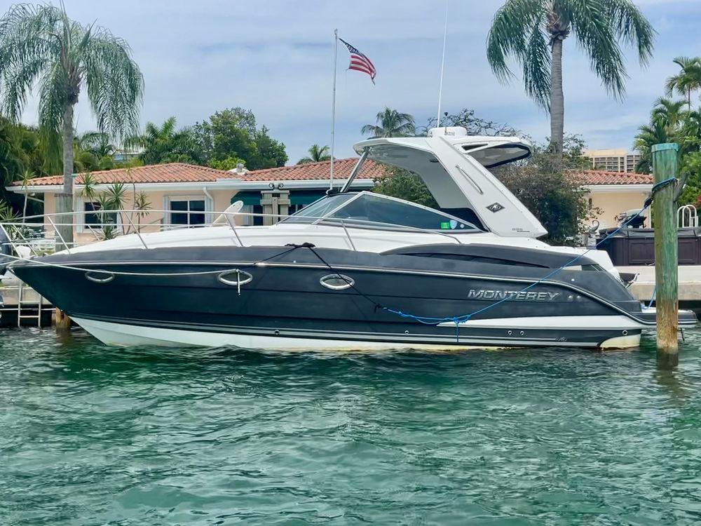 The Monterey’s well-appointed interior with Ultraleather upholstery has sleeping arrangements for six including a double berth forward, convertible dinette, and an aft seating area that converts to a double berth. Additional features include synthetic wood cabin flooring, an entertainment center with a 22" flat-screen TV, a generator, mahogany interior cabinetry, a cockpit wet bar, a transom shower, and a cockpit table. She has twin Volvo Penta 300HP engines that cruise at 26–28 knots (40+ wide open).