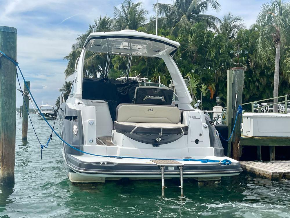 Leave the turmoil of civilization behind aboard the 335 Sport Yacht. A perfect weekend getaway, the 335SY is equipped with many of the features of its larger sisters. The helm on the 335SY is unique featuring twin forward facing helm seats and chart storage on the power side. Built in steps in the cabin door allow safe access to the bow where a large sun pad awaits.