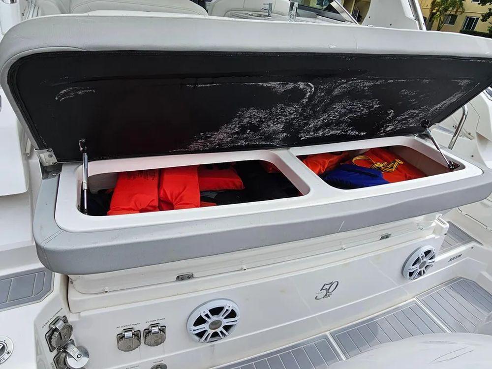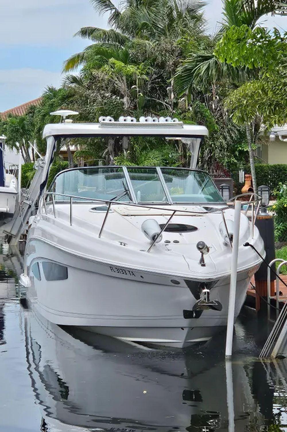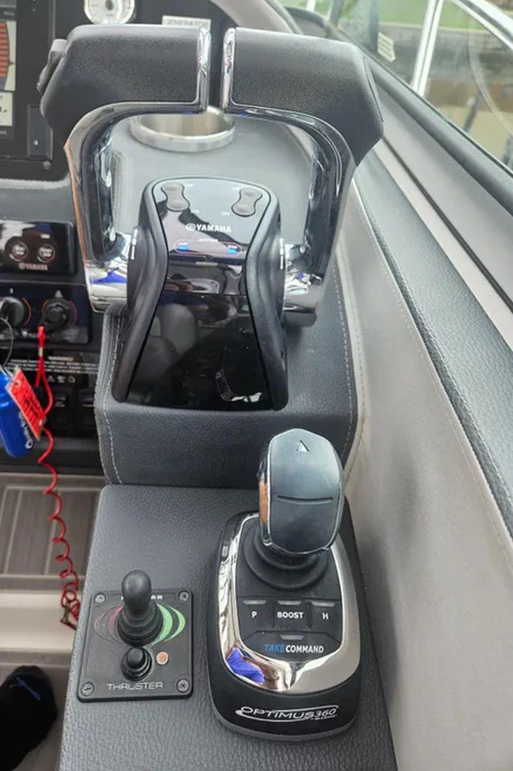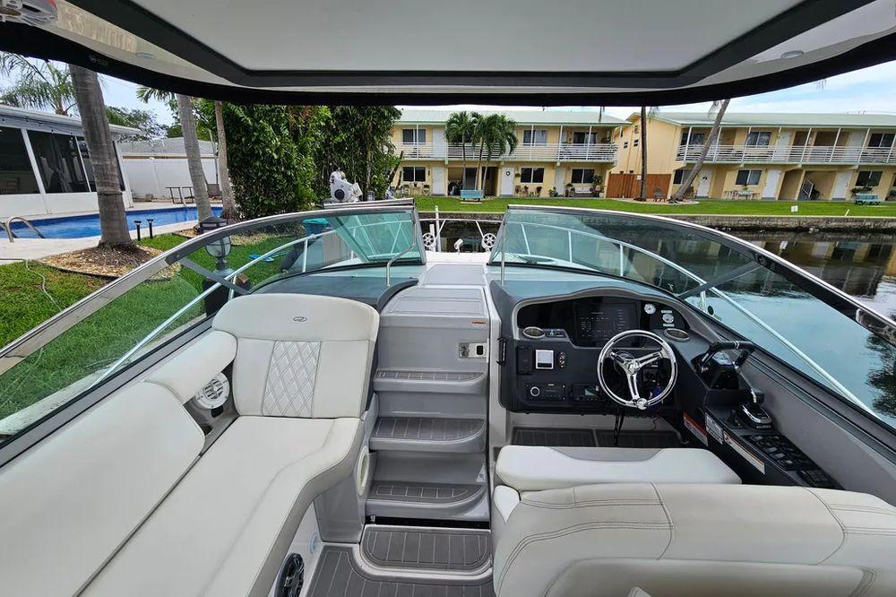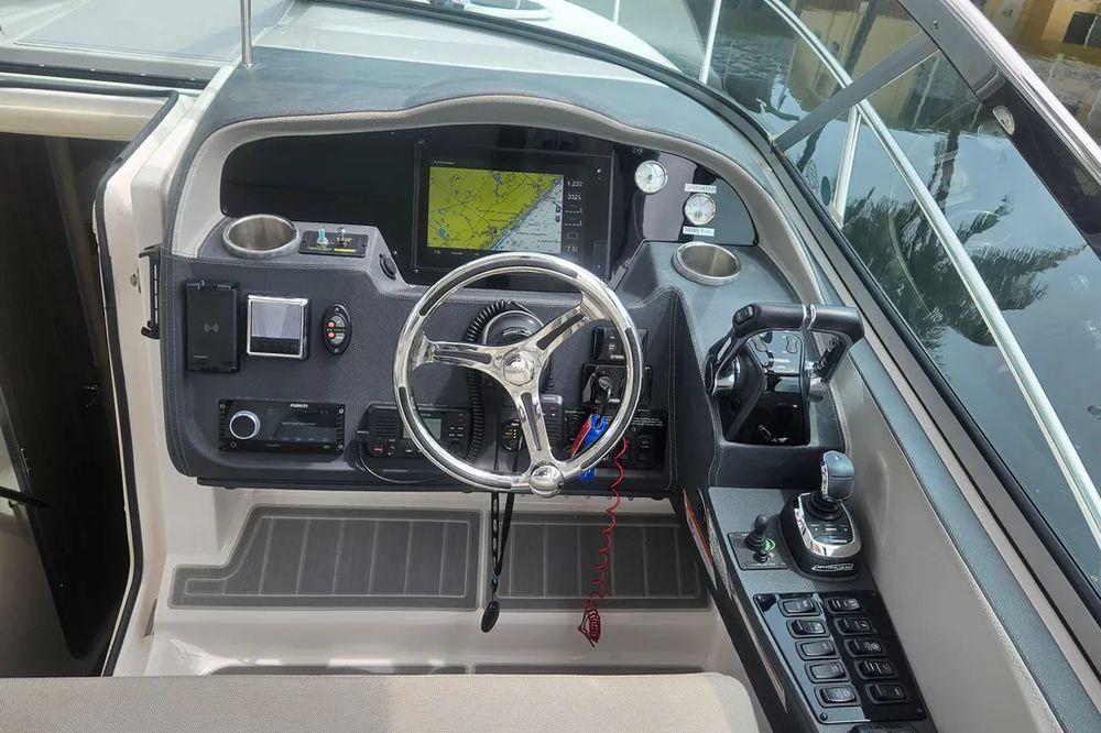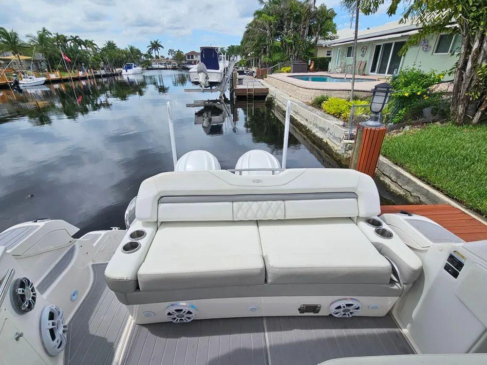 She is powered with a pair of Yamaha 300's and has joystick controls for ease of docking. You'll be cruising in comfort with the cockpit AC and the diesel generator will make long weekends on the hook a breeze. Her versatile seating layout is key with ample space for your guests and their gear. The cabin follows this theme with a large sofa, a queen size bed aft and a v-birth forward. The galley is fully equipped with 2 burner cook top a microwave and fridge.