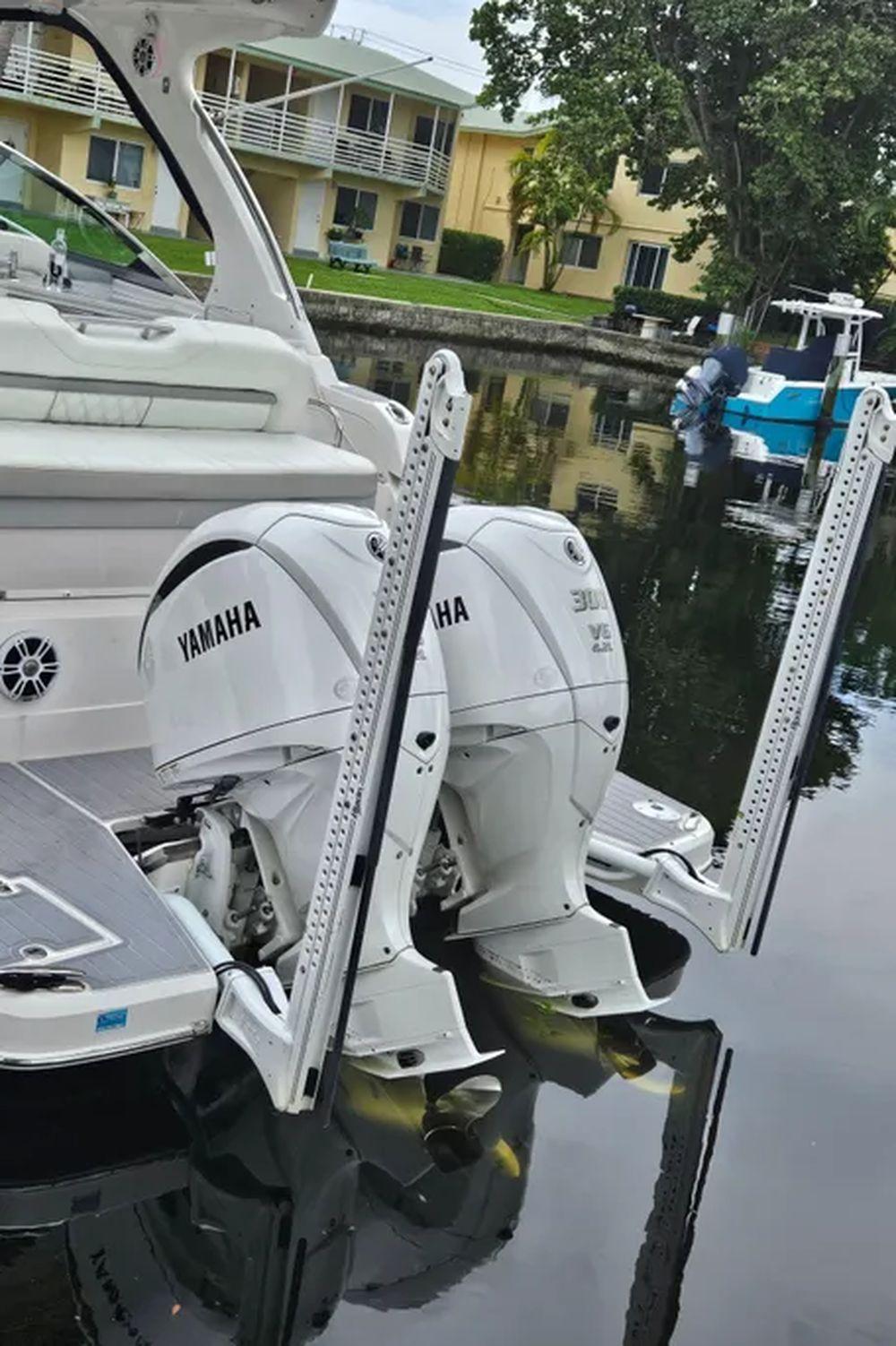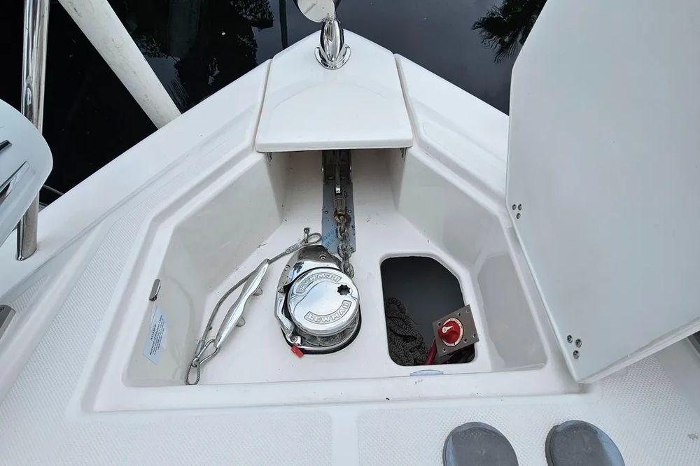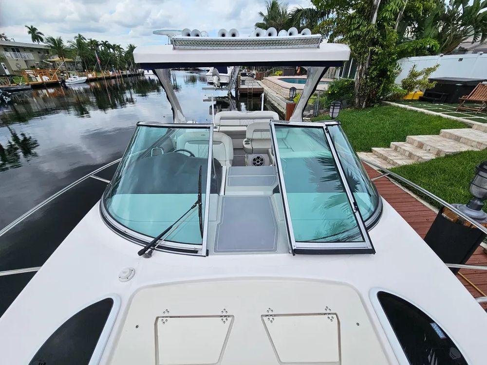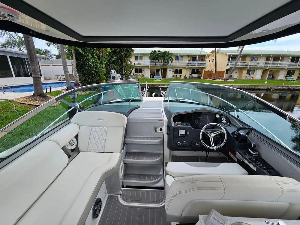 She is powered with a pair of Yamaha 300's and has joystick controls for ease of docking. You'll be cruising in comfort with the cockpit AC and the diesel generator will make long weekends on the hook a breeze. Her versatile seating layout is key with ample space for your guests and their gear. The cabin follows this theme with a large sofa, a queen size bed aft and a v-birth forward. The galley is fully equipped with 2 burner cook top a microwave and fridge.