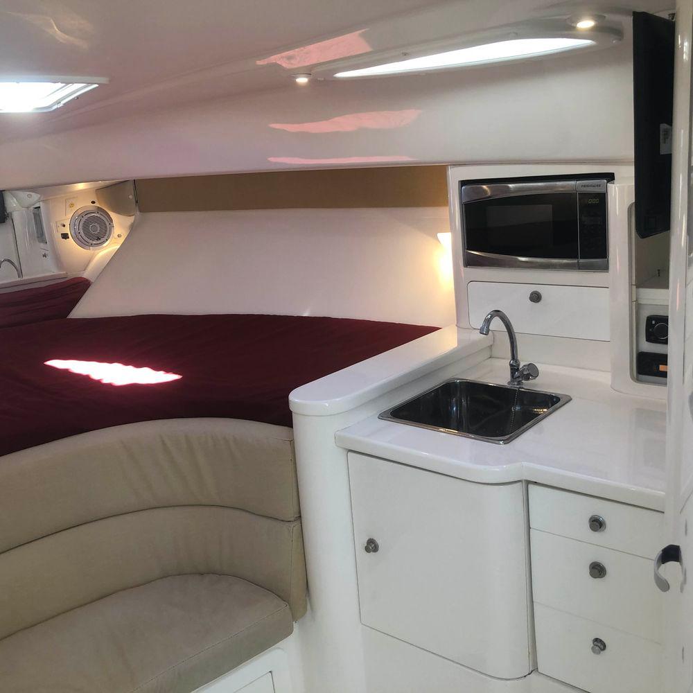 - To starboard is the galley with a single basin stainless sink, Frigidaire microwave and additional drawer storage below