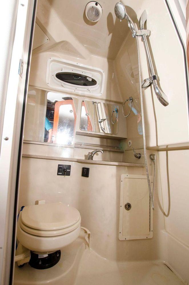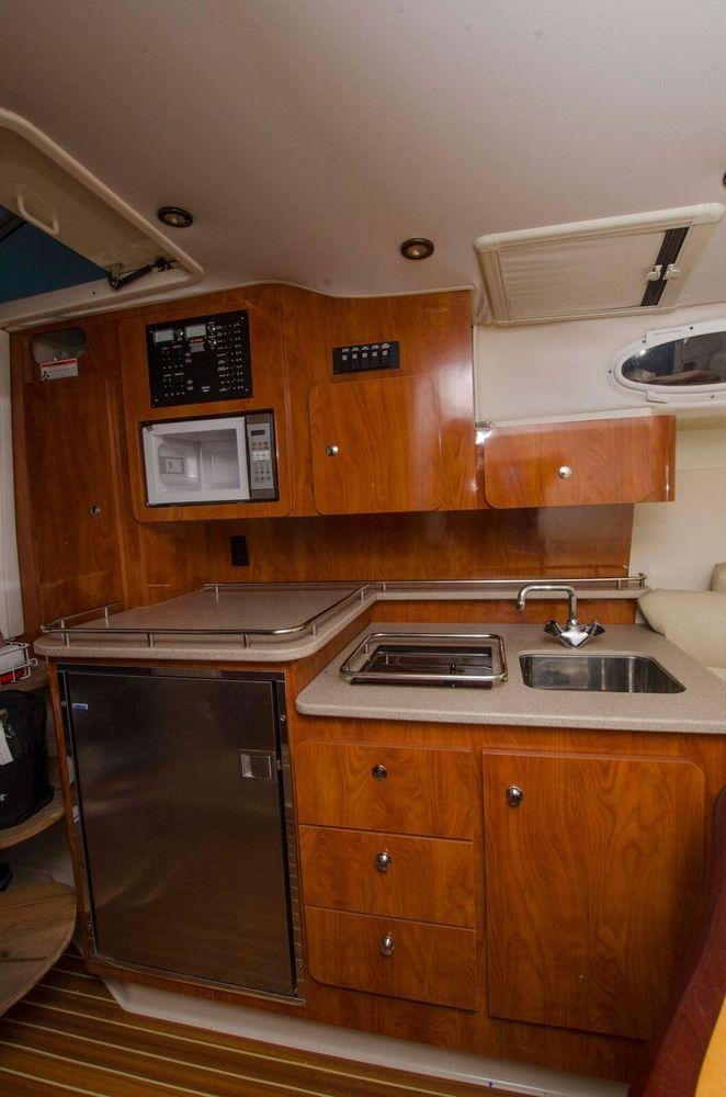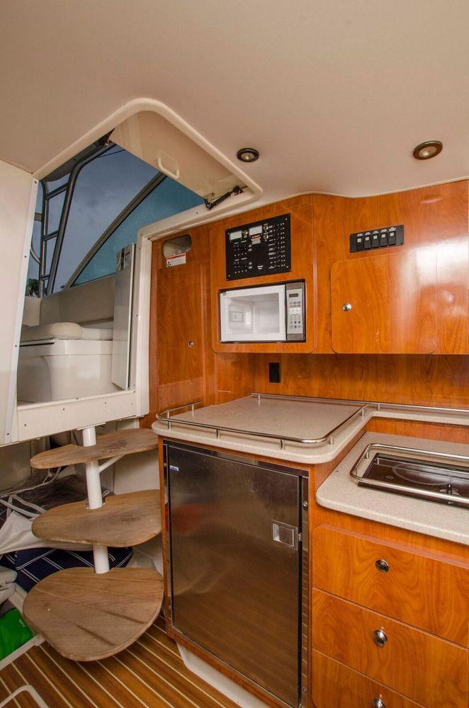 Generator, air conditioning, windlass, a large windshield with walk-thru to foredeck, port and starboard pilot berths for additional sleeping capacity, and a full galley with refrigerator, microwave, stainless sink Corian countertops and a coffee maker. There is sleeping room for up to six.