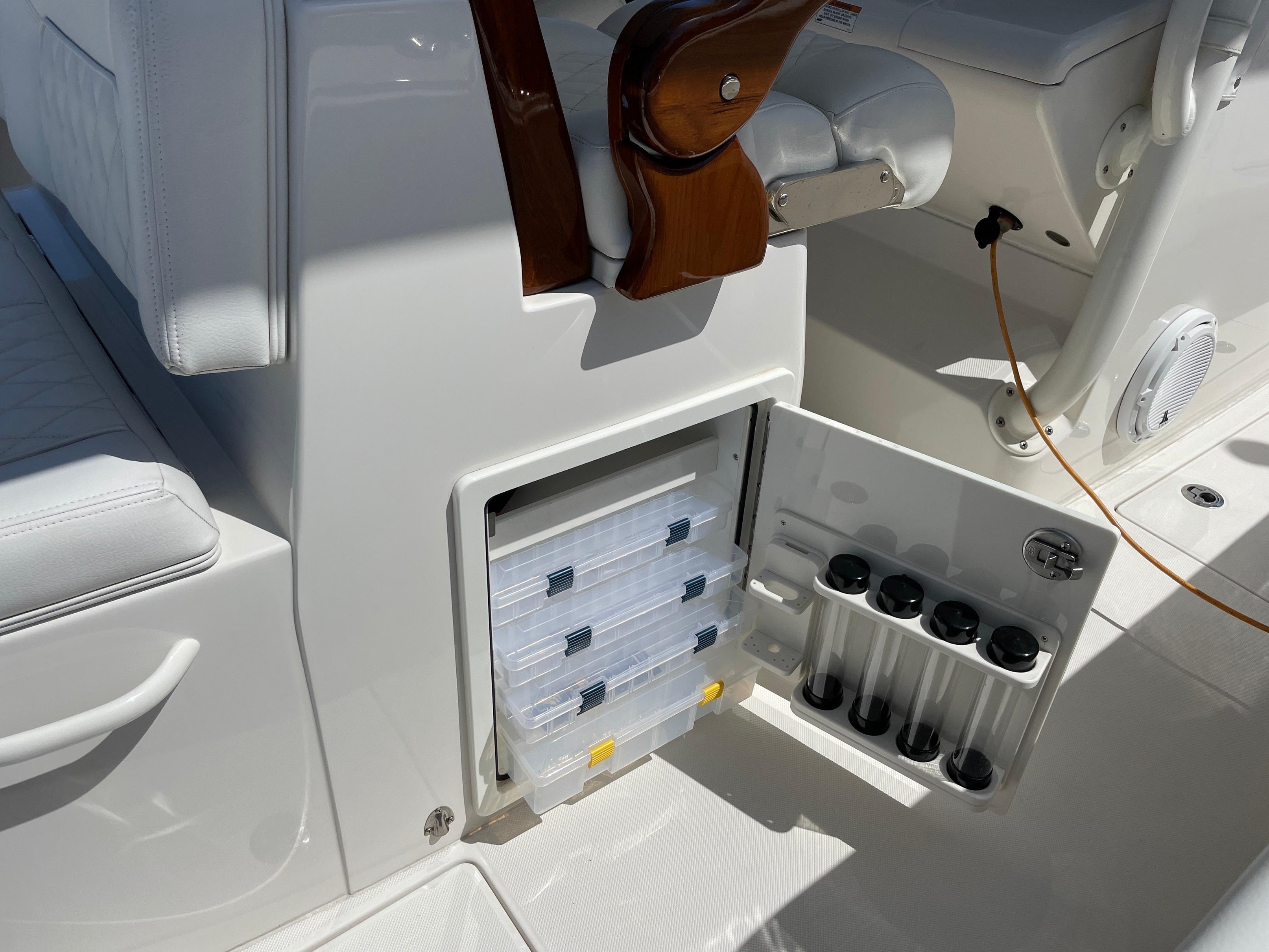 - Livewell, Tackle Storage, Cushion, Rod Holders, Helm Seat with Drink Holders & Folding Footrest