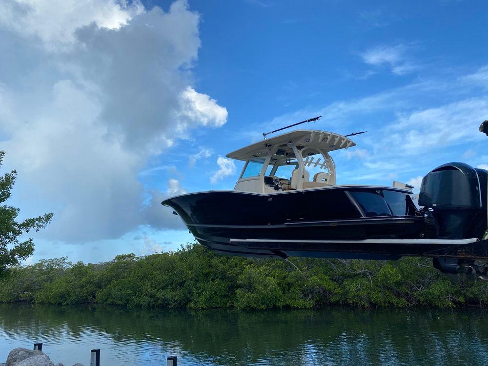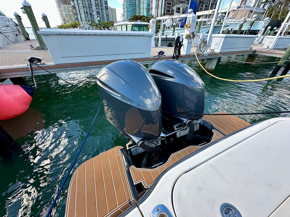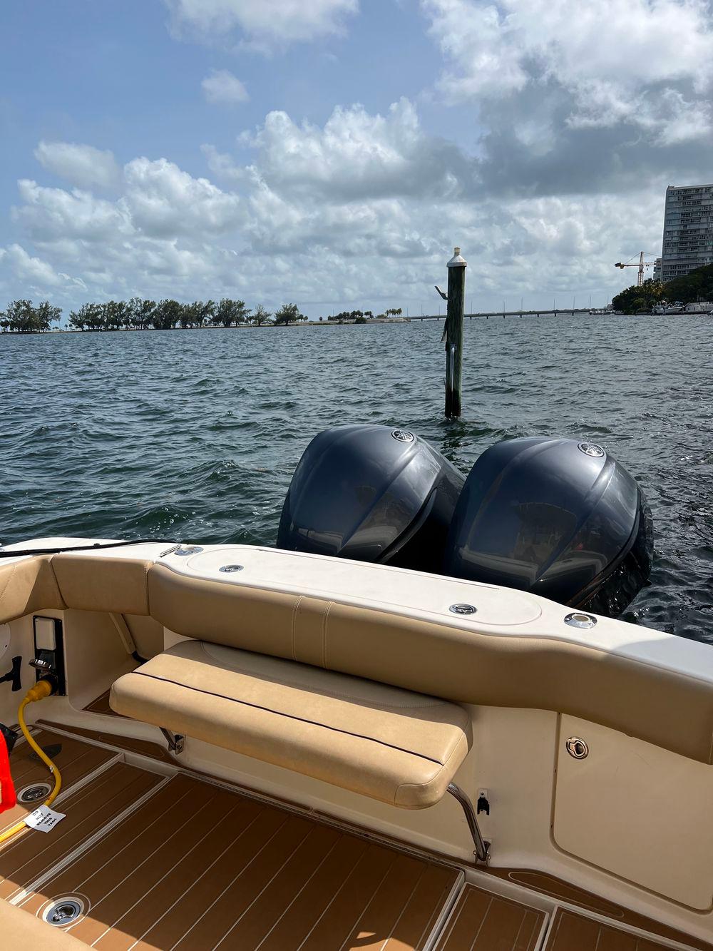 The 345 XSF boasts the revolutionary Scout Stepped Hull Technology for higher performance and increased fuel economy and showcases a top speed range in the mid-high 60s with twin Yamaha 350 hp outboards. With a LOA of 34’ 11” and a beam of 10’ 9” the boat is sleek, stylish and very roomy for anglers and their gear. The helm offers a powder coated patented T-top hardtop with a glass enclosure, 11 rocket launchers, and the optional electric retractable fiberglass sun shade that gives way to a moon roof in the hardtop As well as additional shade for the aft deck.