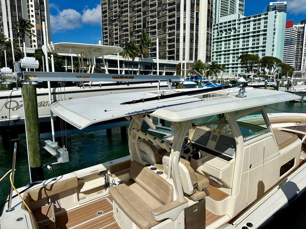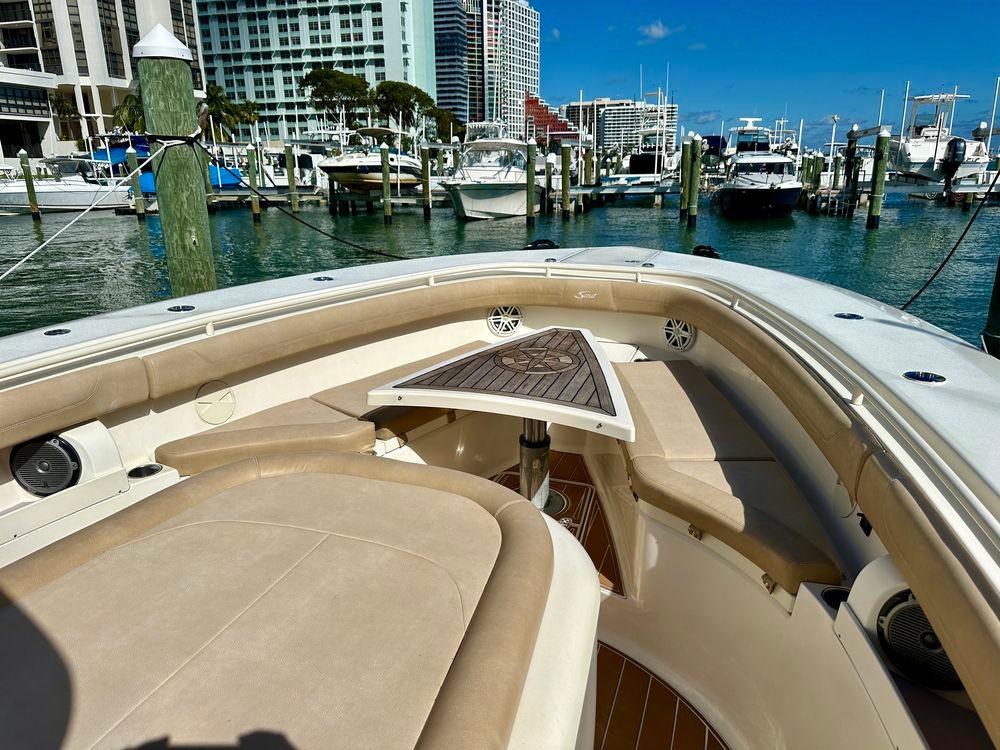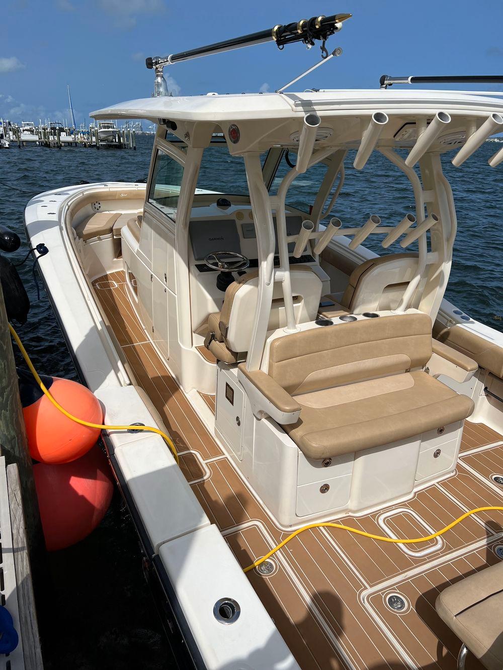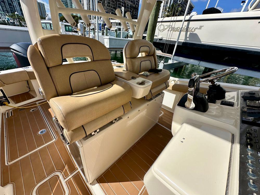 The 345 XSF boasts the revolutionary Scout Stepped Hull Technology for higher performance and increased fuel economy and showcases a top speed range in the mid-high 60s with twin Yamaha 350 hp outboards. With a LOA of 34’ 11” and a beam of 10’ 9” the boat is sleek, stylish and very roomy for anglers and their gear. The helm offers a powder coated patented T-top hardtop with a glass enclosure, 11 rocket launchers, and the optional electric retractable fiberglass sun shade that gives way to a moon roof in the hardtop As well as additional shade for the aft deck.