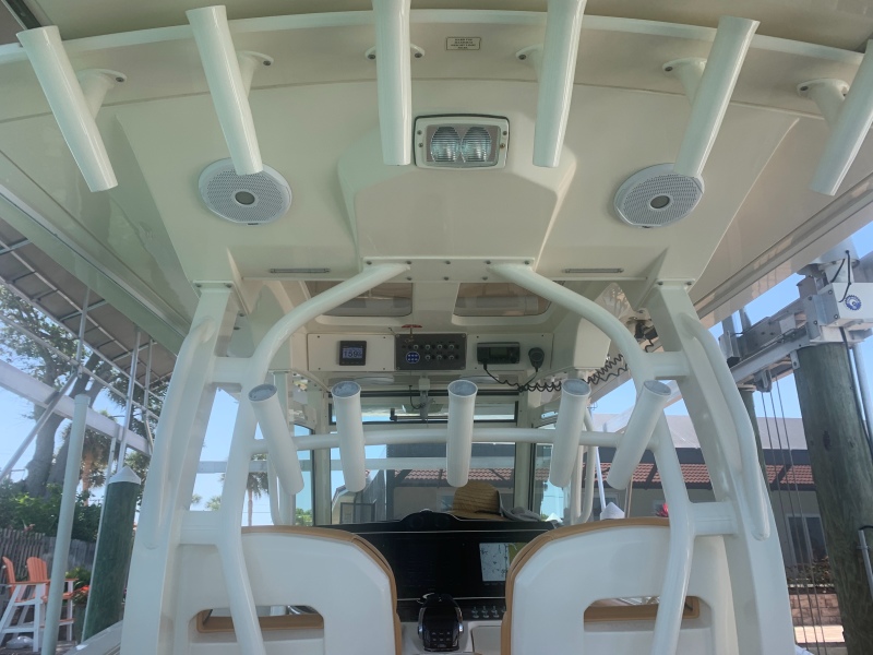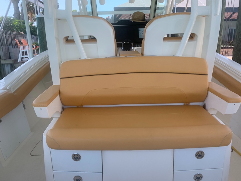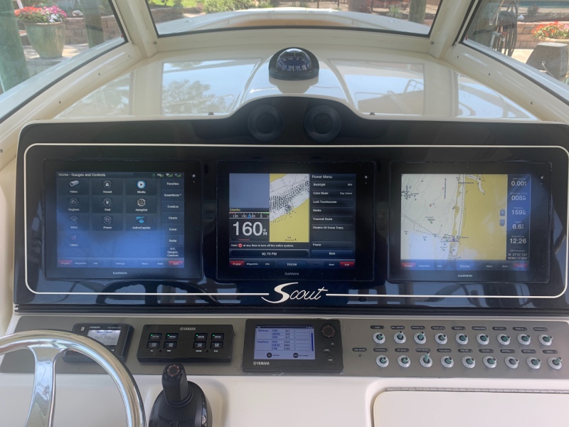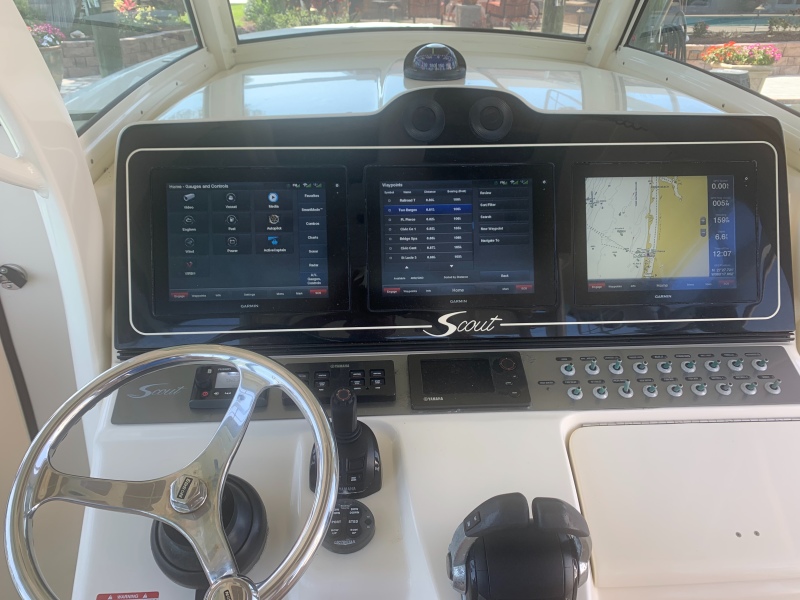 A completely fly-by-wire system controls the triple Yamaha F300 outboards, making them incredibly responsive. In addition to Yamaha's CommandLink electronic throttle and shift, Scout incorporated the Optimus steering system as standard on the 350 LXF. Optimus provides adjustable steering response according to speed. Interestingly, you never consciously notice the change. The system also provides more accurate control of the (3) 12-inch display Garmin navigation system and autopilot.