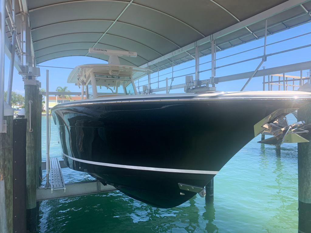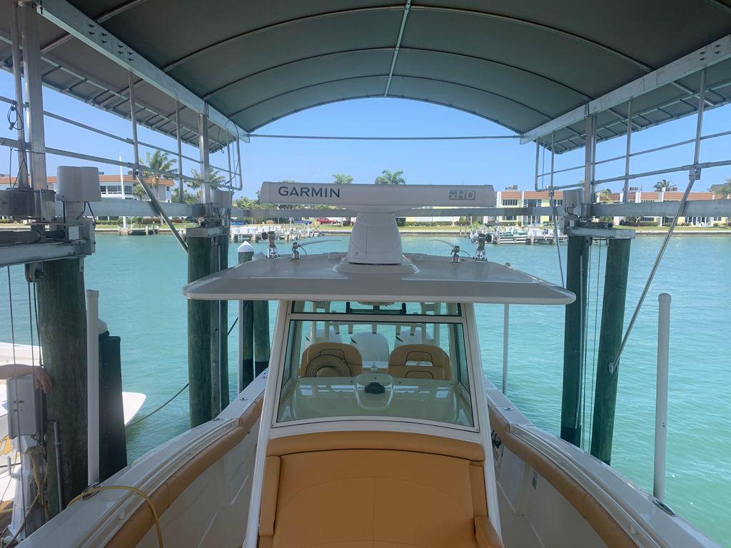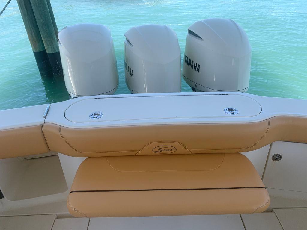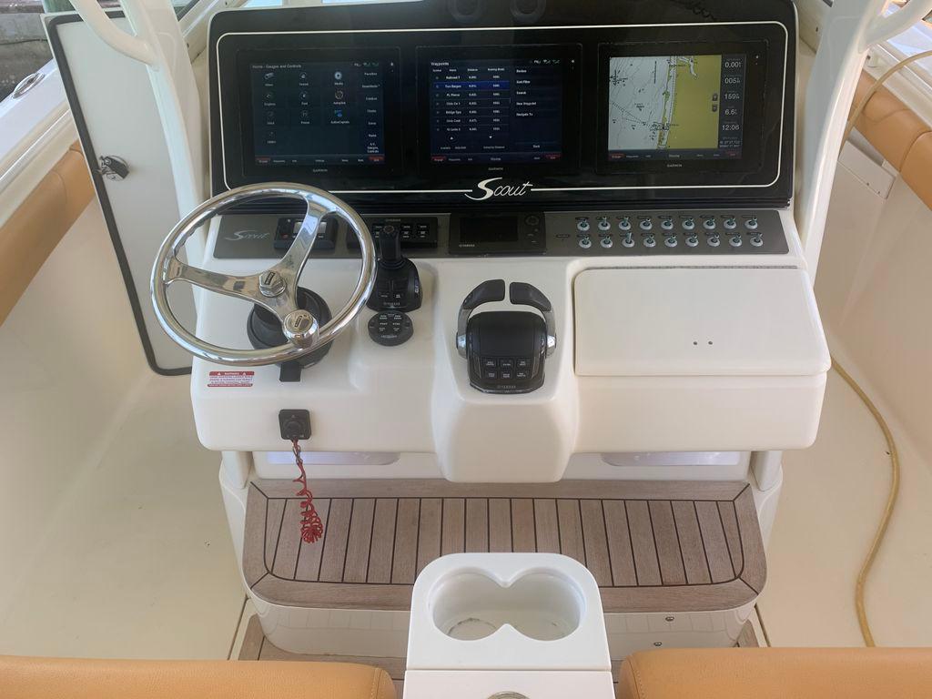 A completely fly-by-wire system controls the triple Yamaha F300 outboards, making them incredibly responsive. In addition to Yamaha's CommandLink electronic throttle and shift, Scout incorporated the Optimus steering system as standard on the 350 LXF. Optimus provides adjustable steering response according to speed. Interestingly, you never consciously notice the change. The system also provides more accurate control of the (3) 12-inch display Garmin navigation system and autopilot.