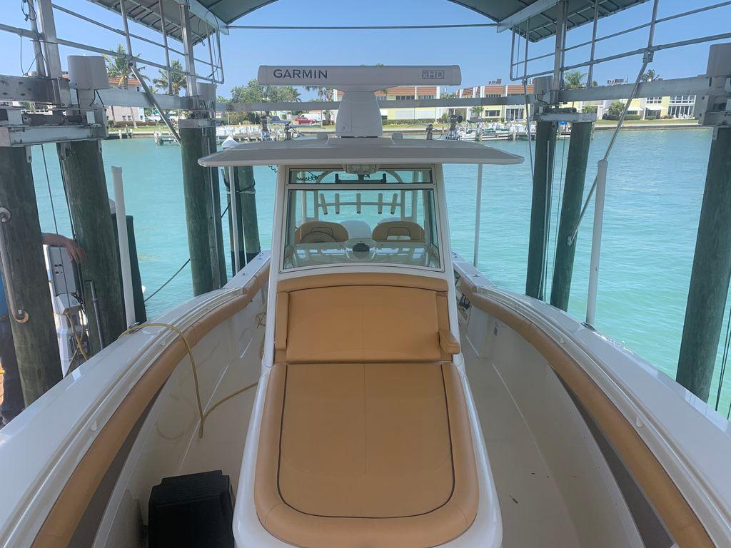 A completely fly-by-wire system controls the triple Yamaha F300 outboards, making them incredibly responsive. In addition to Yamaha's CommandLink electronic throttle and shift, Scout incorporated the Optimus steering system as standard on the 350 LXF. Optimus provides adjustable steering response according to speed. Interestingly, you never consciously notice the change. The system also provides more accurate control of the (3) 12-inch display Garmin navigation system and autopilot.