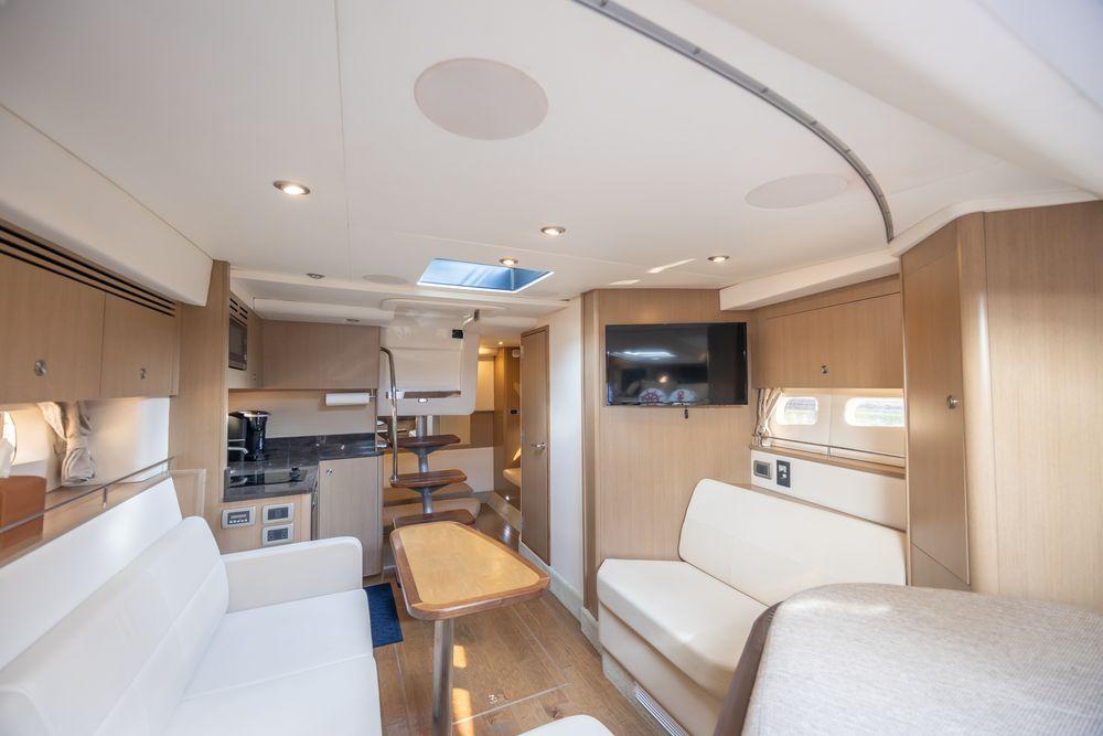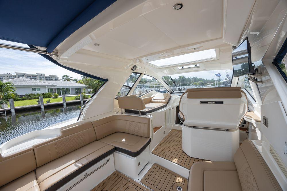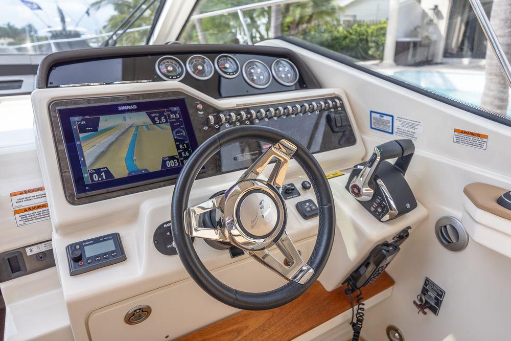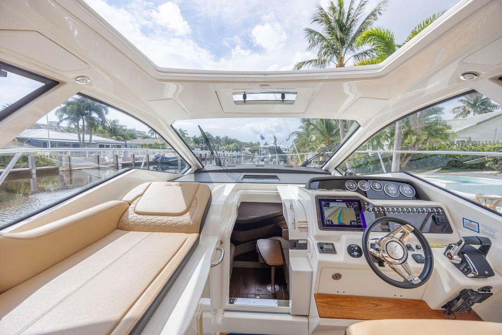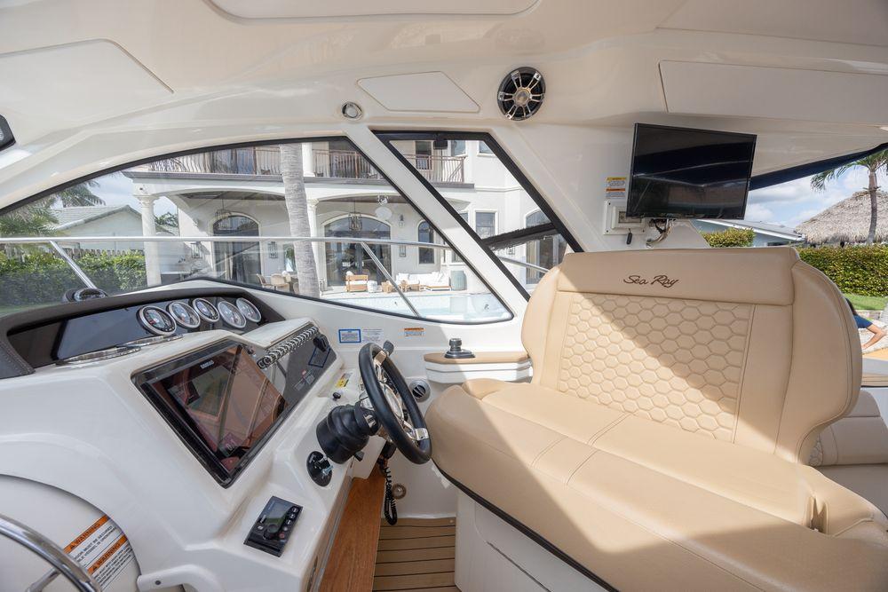 She is equipped with the latest upgrades that Sea Ray started to offer on their 2019 models and beyond. Joystick for control even a child can easilly master. Electronics were upgraded by the owner to Gen 2 Mercury marine to add new features including Activetrim built into DTS controls. Electric sunroof with blue and white LED lighting, cockpit and interior AC units, US made Sure Shade for shading in cockpit and on her extended swim platform. Norwegian brand Simrad navigation system and top of the line maritime audio Fusion with cabin and cockpit controls with Bluetooth connectivity.