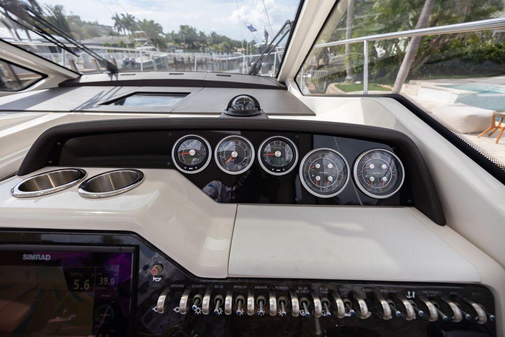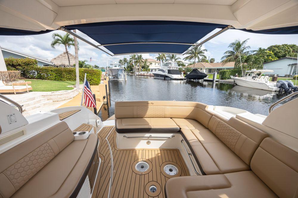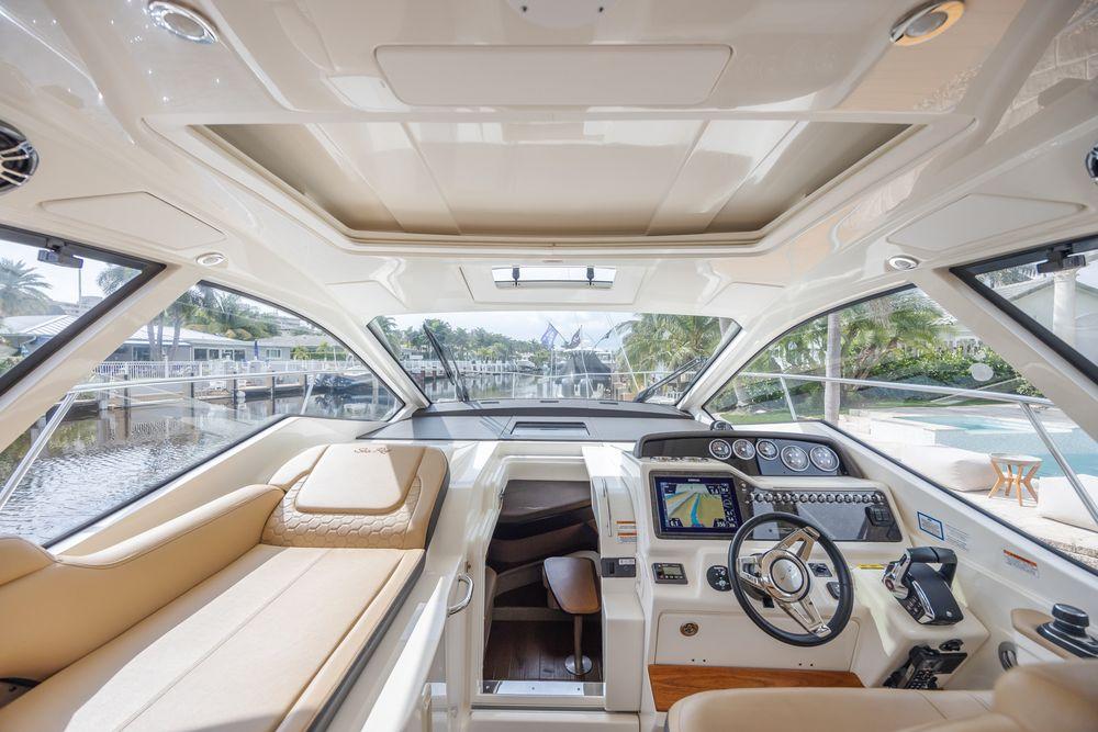 She is equipped with the latest upgrades that Sea Ray started to offer on their 2019 models and beyond. Joystick for control even a child can easilly master. Electronics were upgraded by the owner to Gen 2 Mercury marine to add new features including Activetrim built into DTS controls. Electric sunroof with blue and white LED lighting, cockpit and interior AC units, US made Sure Shade for shading in cockpit and on her extended swim platform. Norwegian brand Simrad navigation system and top of the line maritime audio Fusion with cabin and cockpit controls with Bluetooth connectivity.