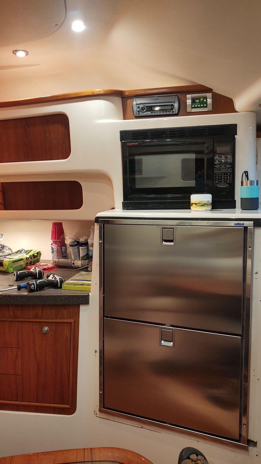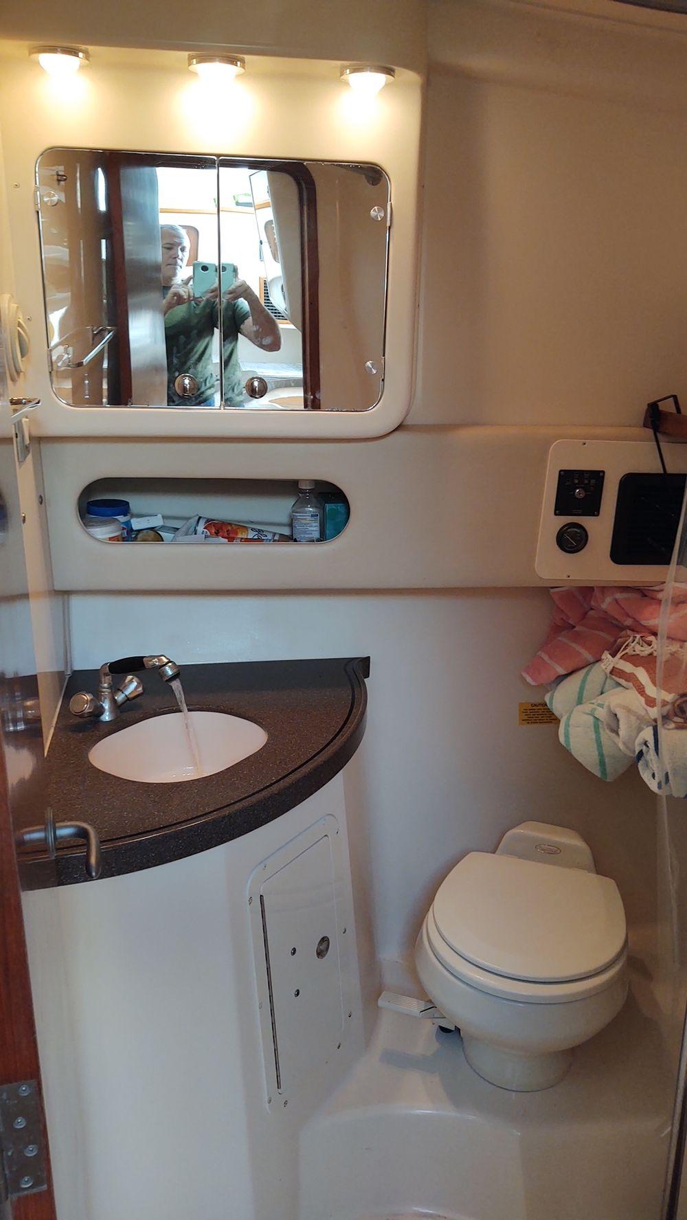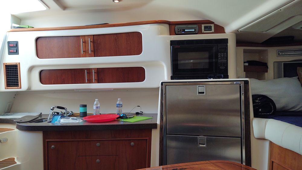 The interior of the Grady-White Express 360 is at an entirely different level. The space that results from not requiring an inboard engine room allows a cabin size that compares to the interior of a much larger sportfishing yacht. The 360 cabin offers every amenity to make the family comfortable, and the entire boat certainly entertains guests graciously in a very handsome setting.The cabin centerpiece is an attractive dinette area including a height adjustable teak table with booth-style seating for four. The king size forward v-berth is not only well appointed with lights and shelving, but closes off with a privacy curtain. The bulkhead between the forward vee berth and the main cabin area is accented with a teak divider and lighted glass etched art of a blue marlin. There is ample storage in the teak tambour enclosed cabinetry both above the dinette and over the galley. The entire cabin, from the vee berth captain's quarters to the 56" x 84" aft berth (also with privacy curtain), is cooled with a 16,000 BTU air conditioning unit with zone cooling. There is also variable lighting throughout the cabin. The entertainment area features a 15-inch flat screen TV with DVD player and cable TV inlet, plus a stereo/CD system and Sirius satellite radio capability. The Express 360 galley includes an electric glass top stove with two burners, a roomy freezer drawer with ice maker and a nice refrigerator drawer (similar to the refrigerator/freezer drawers found on custom yachts), and a deep, divided stainless steel sink. There is also a very good quality microwave oven. Countertops are surfaced with durable Corian.