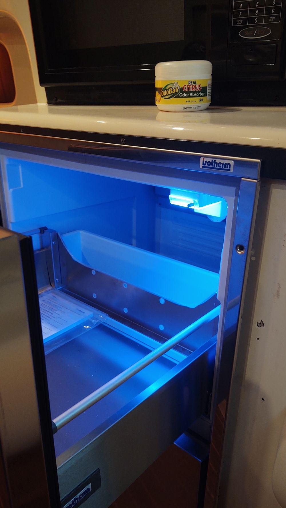 The interior of the Grady-White Express 360 is at an entirely different level. The space that results from not requiring an inboard engine room allows a cabin size that compares to the interior of a much larger sportfishing yacht. The 360 cabin offers every amenity to make the family comfortable, and the entire boat certainly entertains guests graciously in a very handsome setting.The cabin centerpiece is an attractive dinette area including a height adjustable teak table with booth-style seating for four. The king size forward v-berth is not only well appointed with lights and shelving, but closes off with a privacy curtain. The bulkhead between the forward vee berth and the main cabin area is accented with a teak divider and lighted glass etched art of a blue marlin. There is ample storage in the teak tambour enclosed cabinetry both above the dinette and over the galley. The entire cabin, from the vee berth captain's quarters to the 56" x 84" aft berth (also with privacy curtain), is cooled with a 16,000 BTU air conditioning unit with zone cooling. There is also variable lighting throughout the cabin. The entertainment area features a 15-inch flat screen TV with DVD player and cable TV inlet, plus a stereo/CD system and Sirius satellite radio capability. The Express 360 galley includes an electric glass top stove with two burners, a roomy freezer drawer with ice maker and a nice refrigerator drawer (similar to the refrigerator/freezer drawers found on custom yachts), and a deep, divided stainless steel sink. There is also a very good quality microwave oven. Countertops are surfaced with durable Corian.