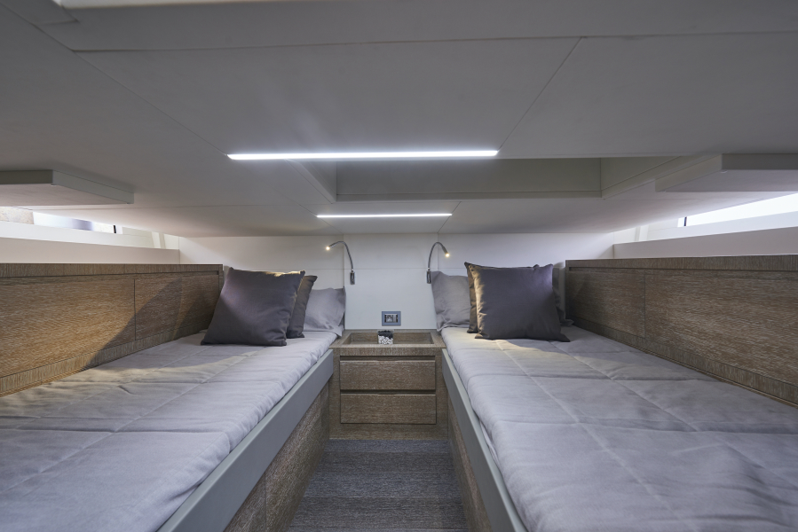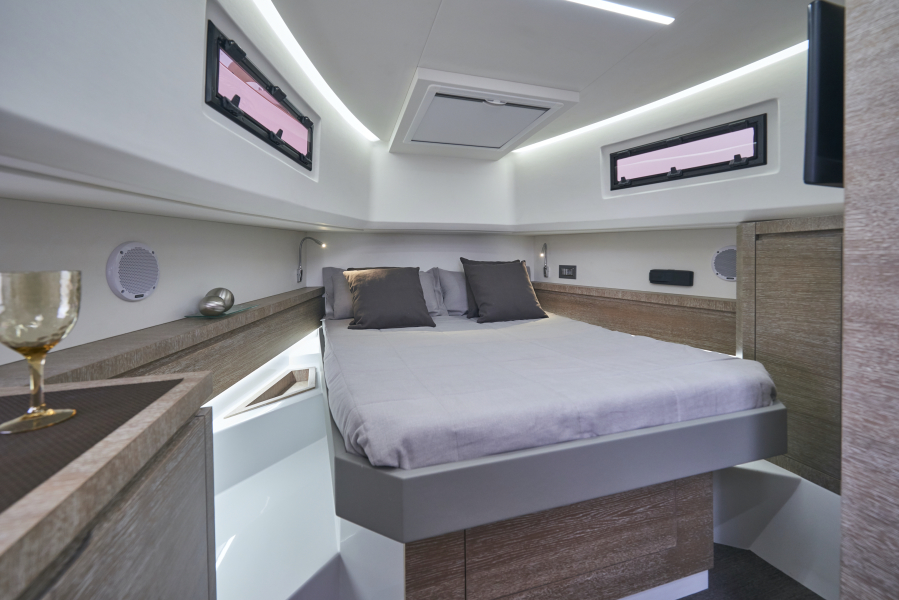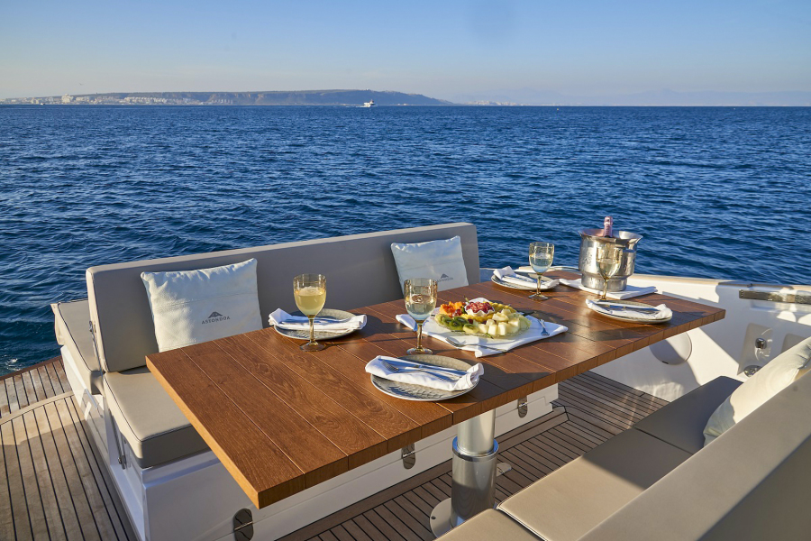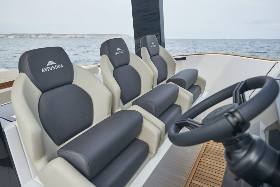 Compact does not mean cramped. The walk-around teak decks offer easy passage around the entire perimeter. The helm station covers the captain and two passengers and likewise offers shade to the aft-facing bench (with a slide-out cooler) on the rear deck. A table is conveniently placed between the aft-facing bench and a forward-facing one—which can also convert into a full deck lounge. The bench backrest joins with the backrest of a luxurious aft deck 3-person sun pad that opens to the teak swim platform. That lounge opens to reveal a wide garage to carry water toys and enable engine access—just another example of Astondoa’s creative use of space. Another sun pad on the bow faces a teak bow seat that also houses docking gear beneath. Storage is also available under the soft, synthetic leather seating and in various compartments tucked into the sturdy, hand-built cabinetry.