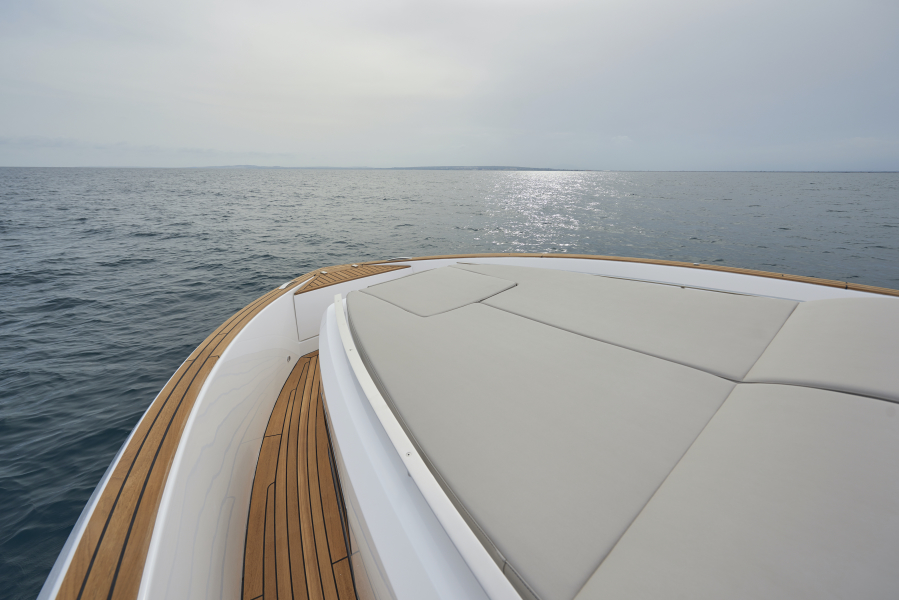 The helm is outfitted with top-quality navigation and electronics, a leather steering wheel, optional bow thruster, optional joystick controls, a sound system that make entertainment a priority and a windshield that protects both passengers and equipment from the elements.
