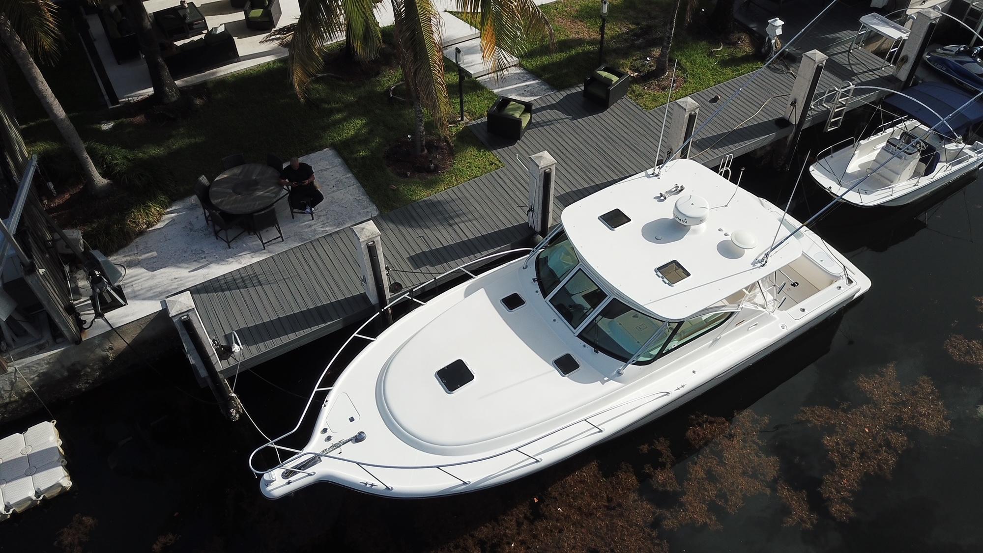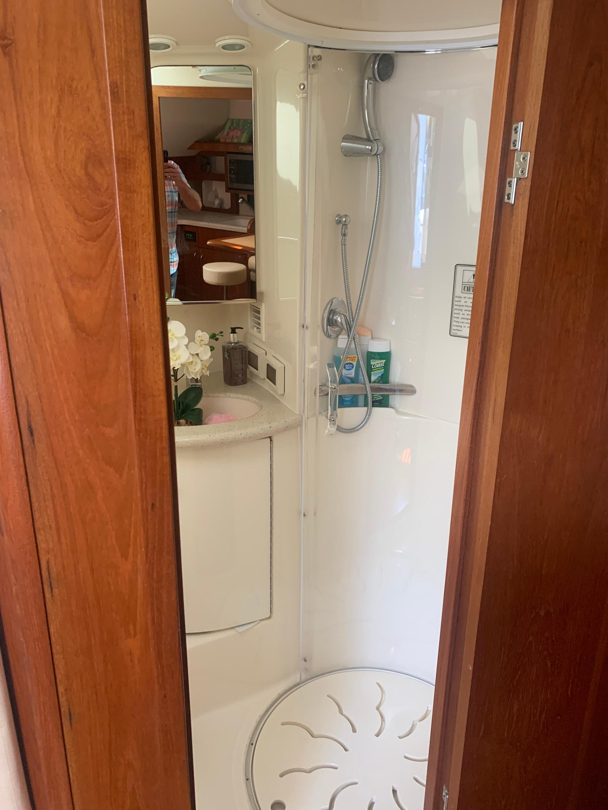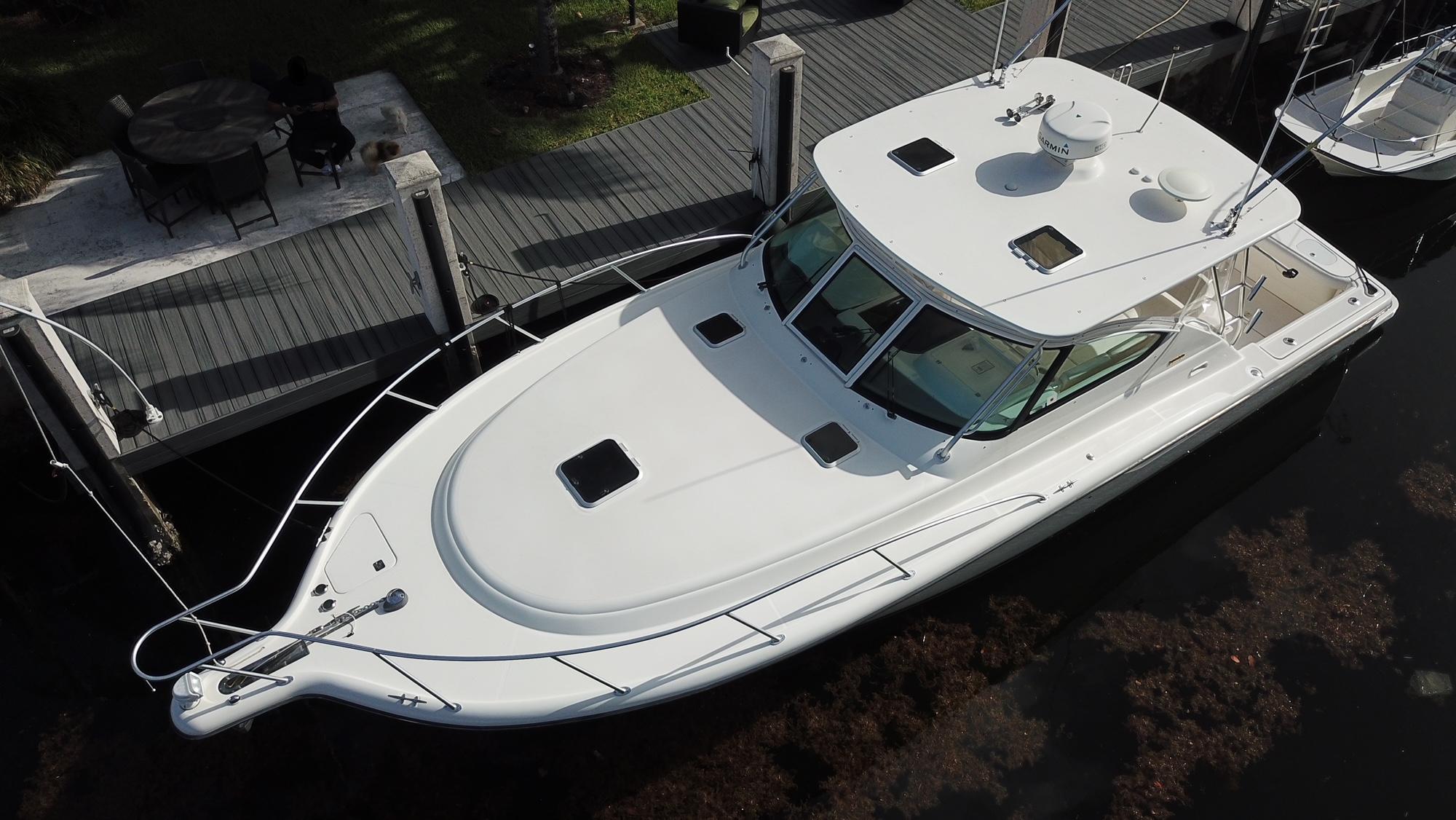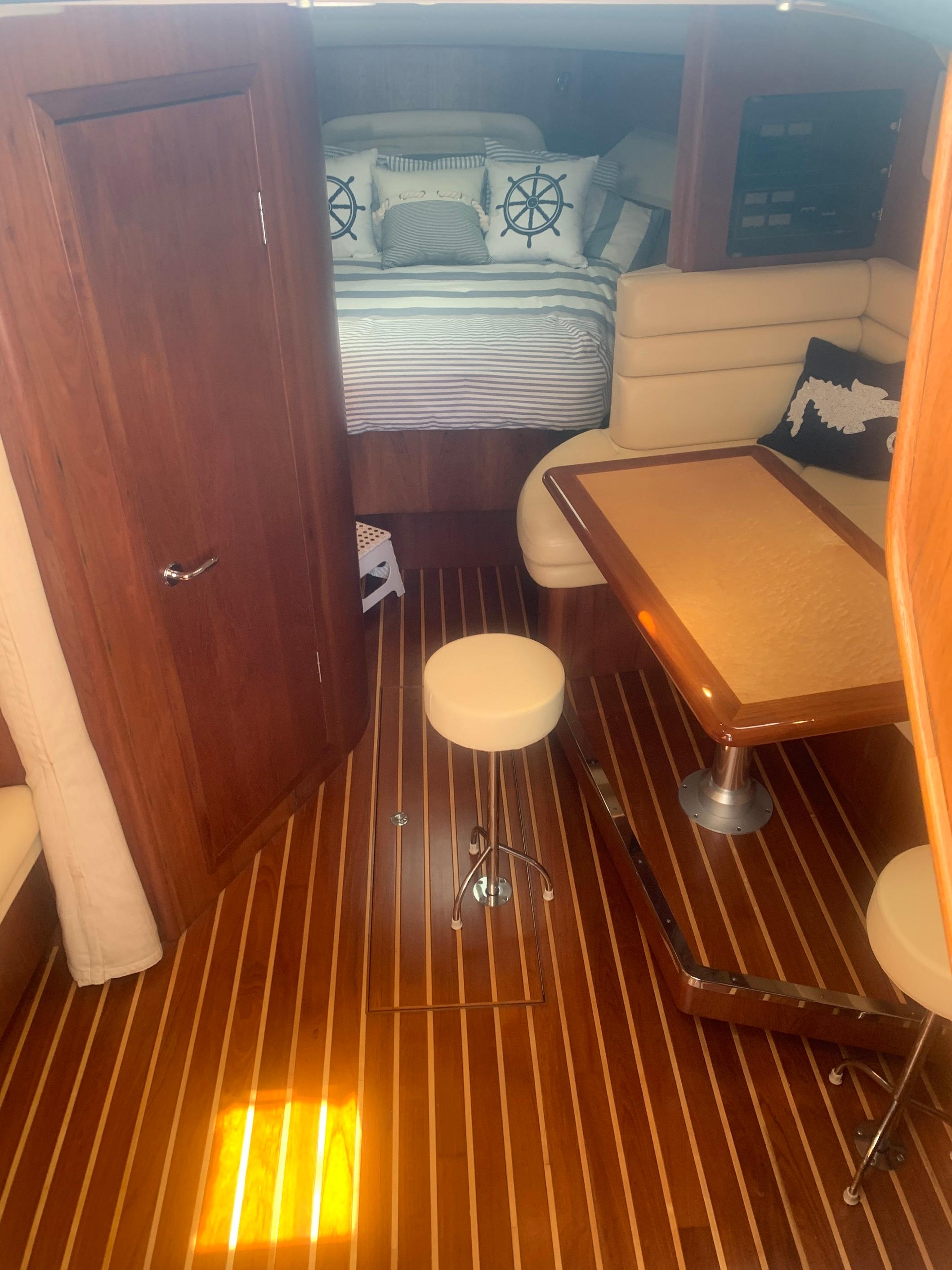 include a hideaway TV in the salon, a cockpit wet bar, transom door and shower, NEW swim platform, side exhausts and wide