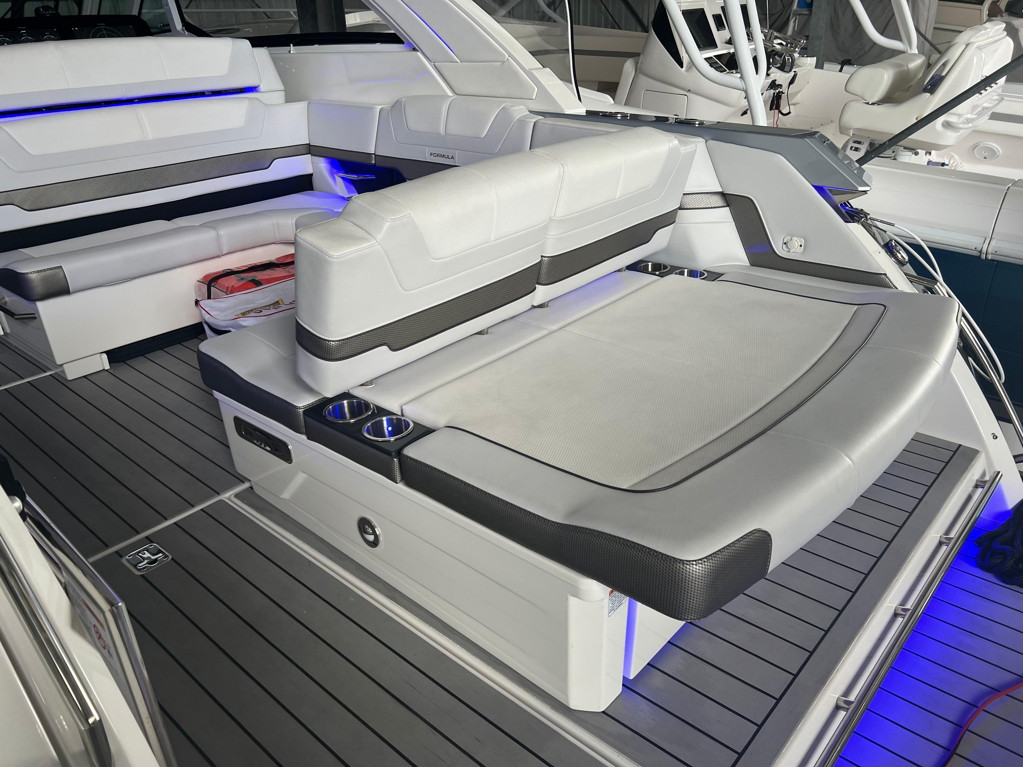 The boat also had Formula’s optional “Swim Platform Sport Station,” a padded, arched rail with six drink holders mounted just