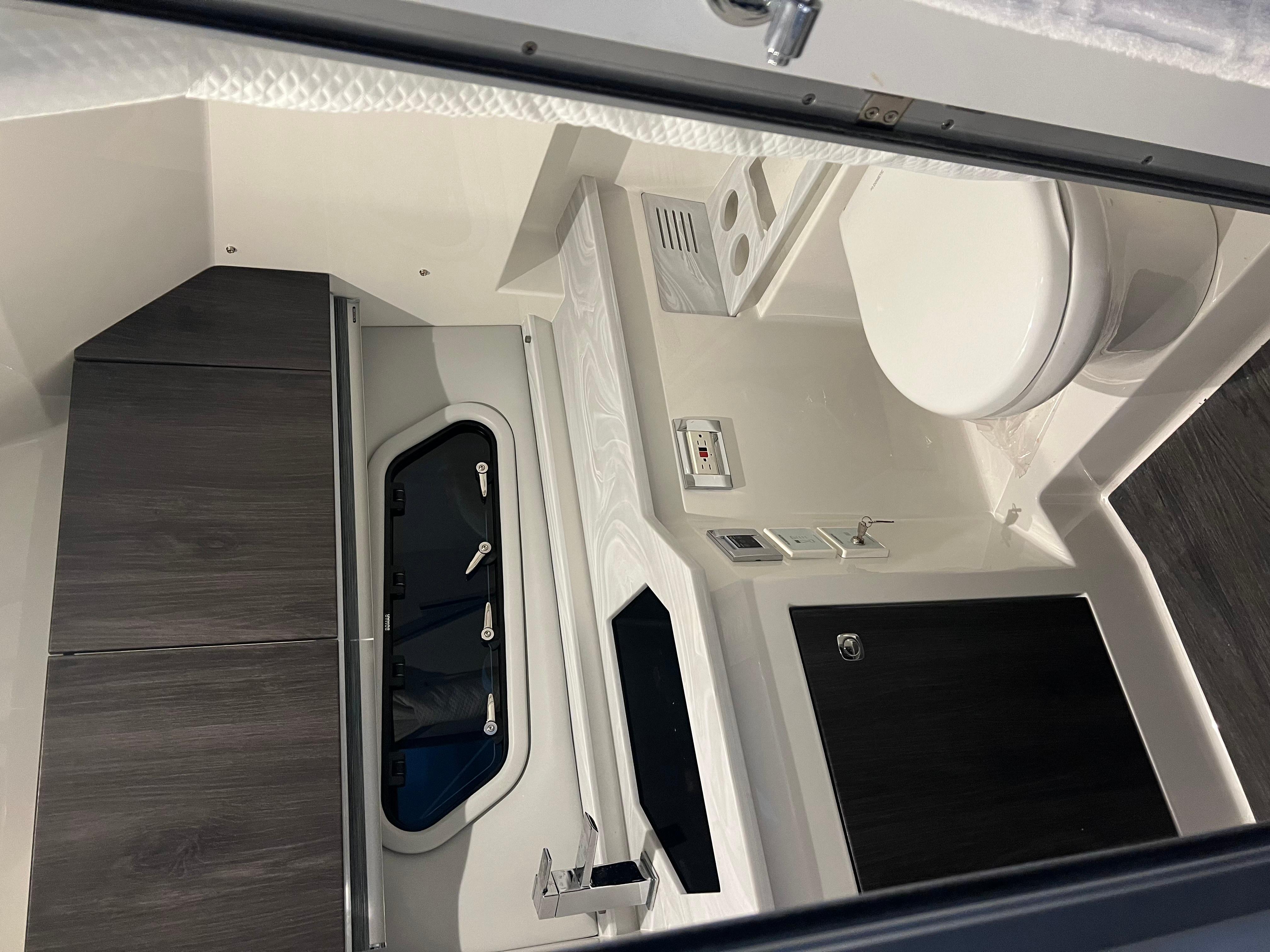 - Molded private head compartment w/vanity, open-grain or high-gloss finish lower doors, upper & lower cabinet storage, Corian countertop, custom-molded sink w/Moen® faucet, porcelain Flush and Forget® VacuFlush® head w/37-gallon holding tank & dockside pumpout, shower, exhaust fan & night light