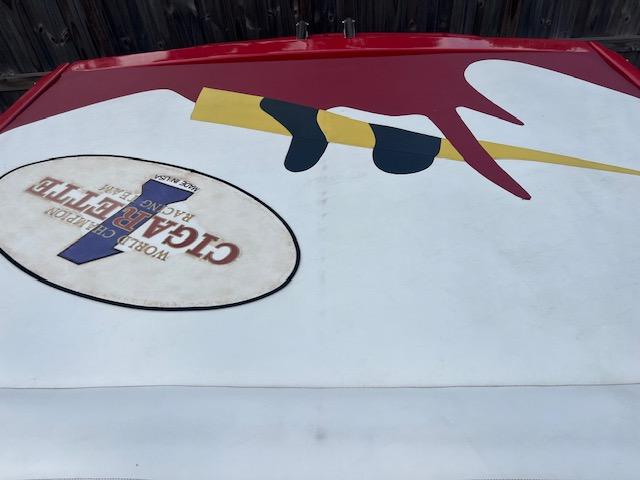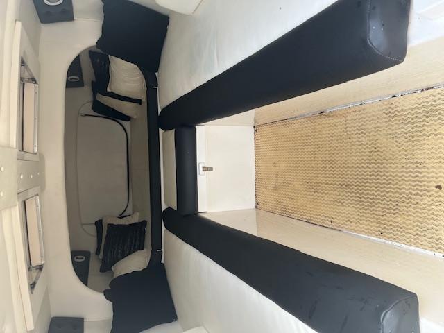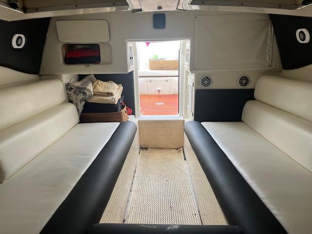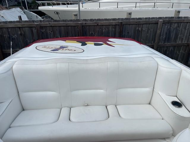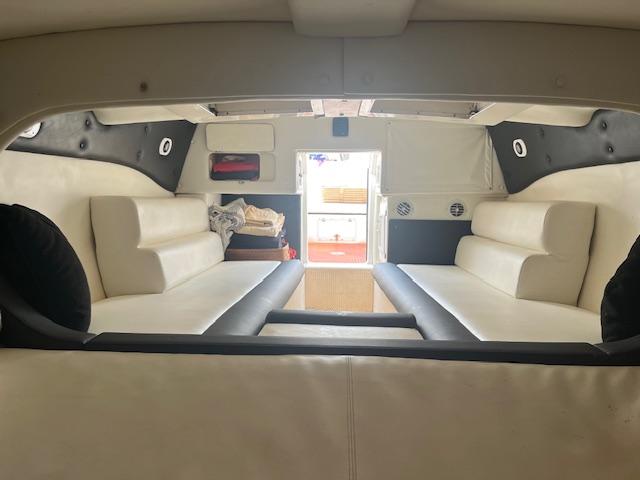 The cockpit features bolster seating and a rear bench, while the cabin offers a clean layout with a V-berth, seating area, and enclosed head. Equipped with K-Plane trim tabs, performance gauges, and striking graphics, this Top Gun has all the hallmarks of Cigarette’s racing heritage.