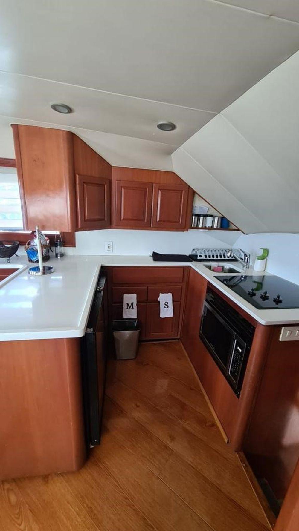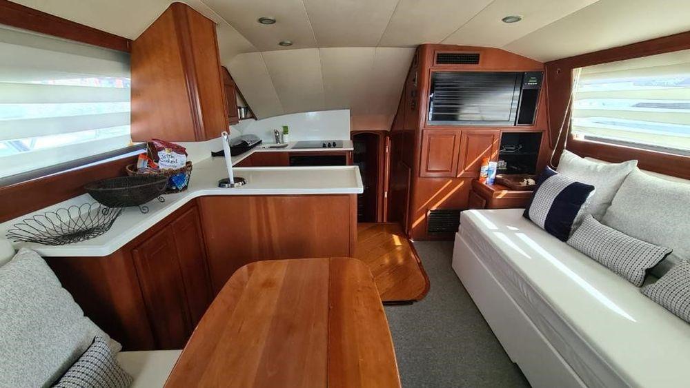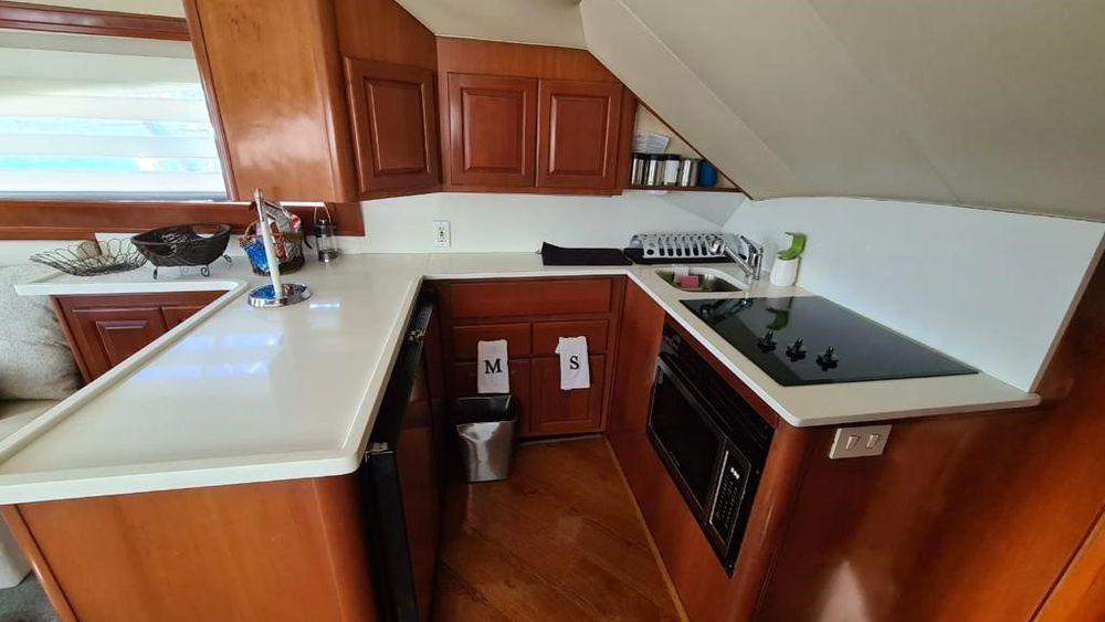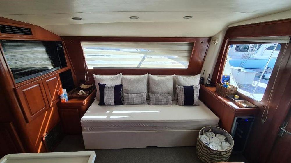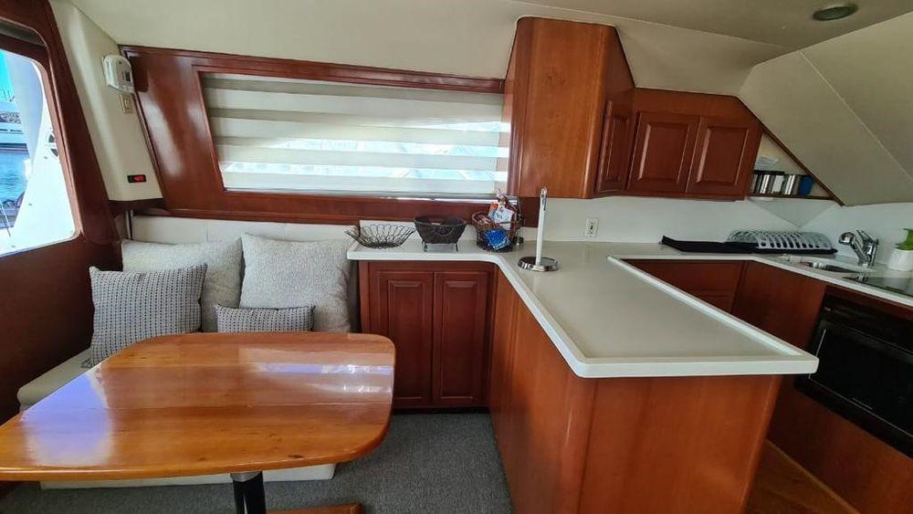 The accommodations below are a reflection of the beauty outside. Rich cherry and beautiful fabrics work in harmony with the padded carpet and galley hardwood floor to present an elegant but durable environment. The salon features a convertible sofa and a pair of barrel chairs. Friends will enjoy the guest stateroom with twin berths and places for all their gear. A dual access head is both convenient and private with its separate stall shower, Corian covered vanity and cabinets.