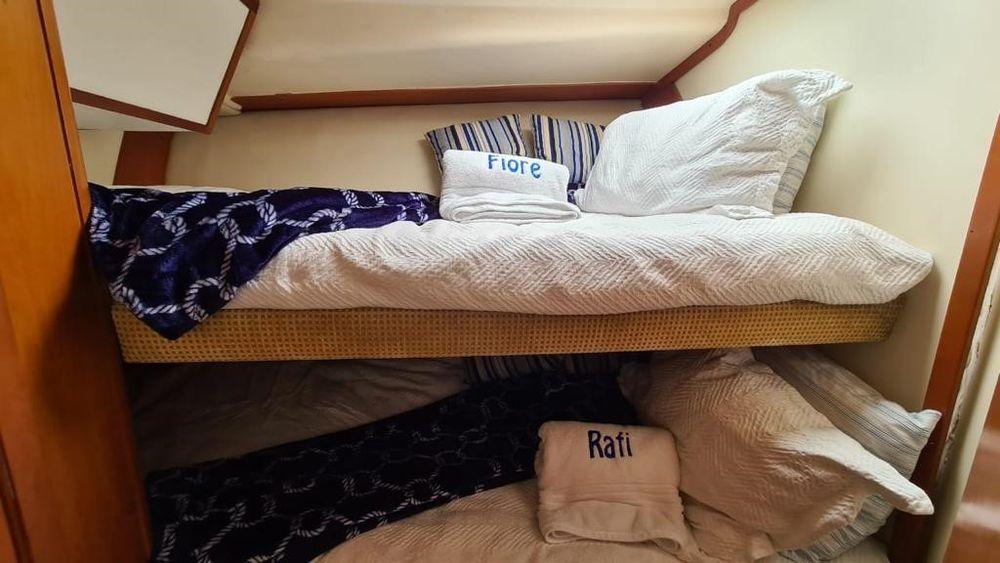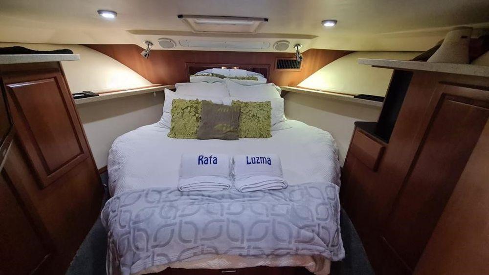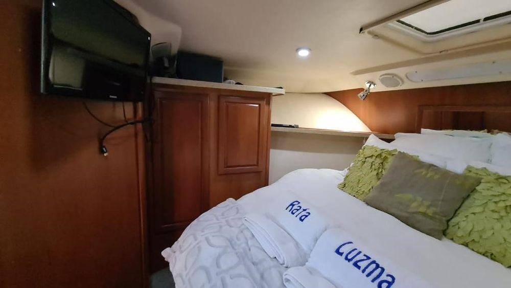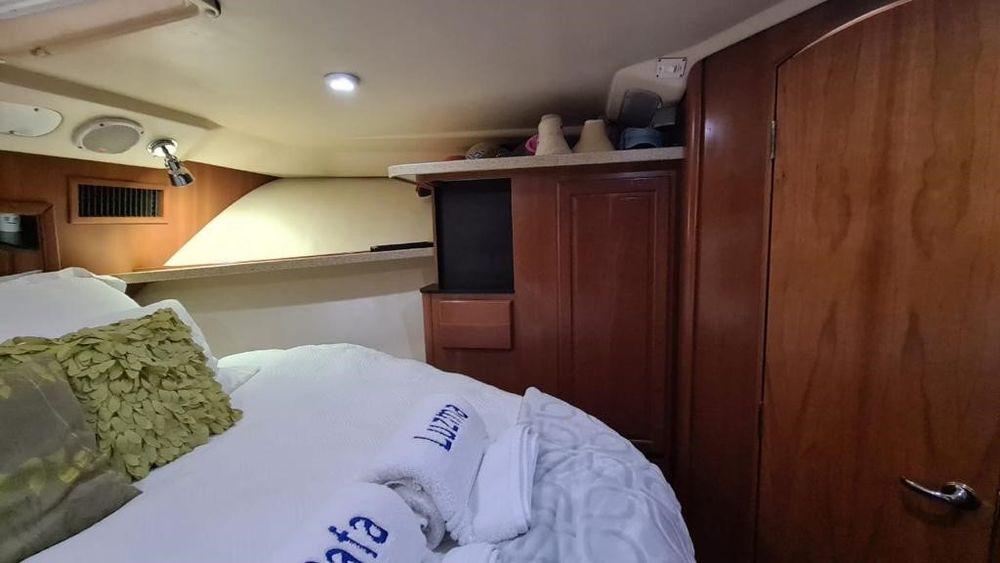 Main Stateroom: Cherry Finish, Cedar-Lined Hanging Lockers – Lighted (2), Designer Fabrics, Bedspread and Pillow Shams, Double Berth w/3 Large Drawers Underneath Fabric-Lined Hull Sides, Inner-Spring Mattress, Private Reading Lights Over Berth, Recessed Overhead led (white/red) Lighting, Soft Headliner, Stereo Speakers, Large Storage Under Berth LED TV