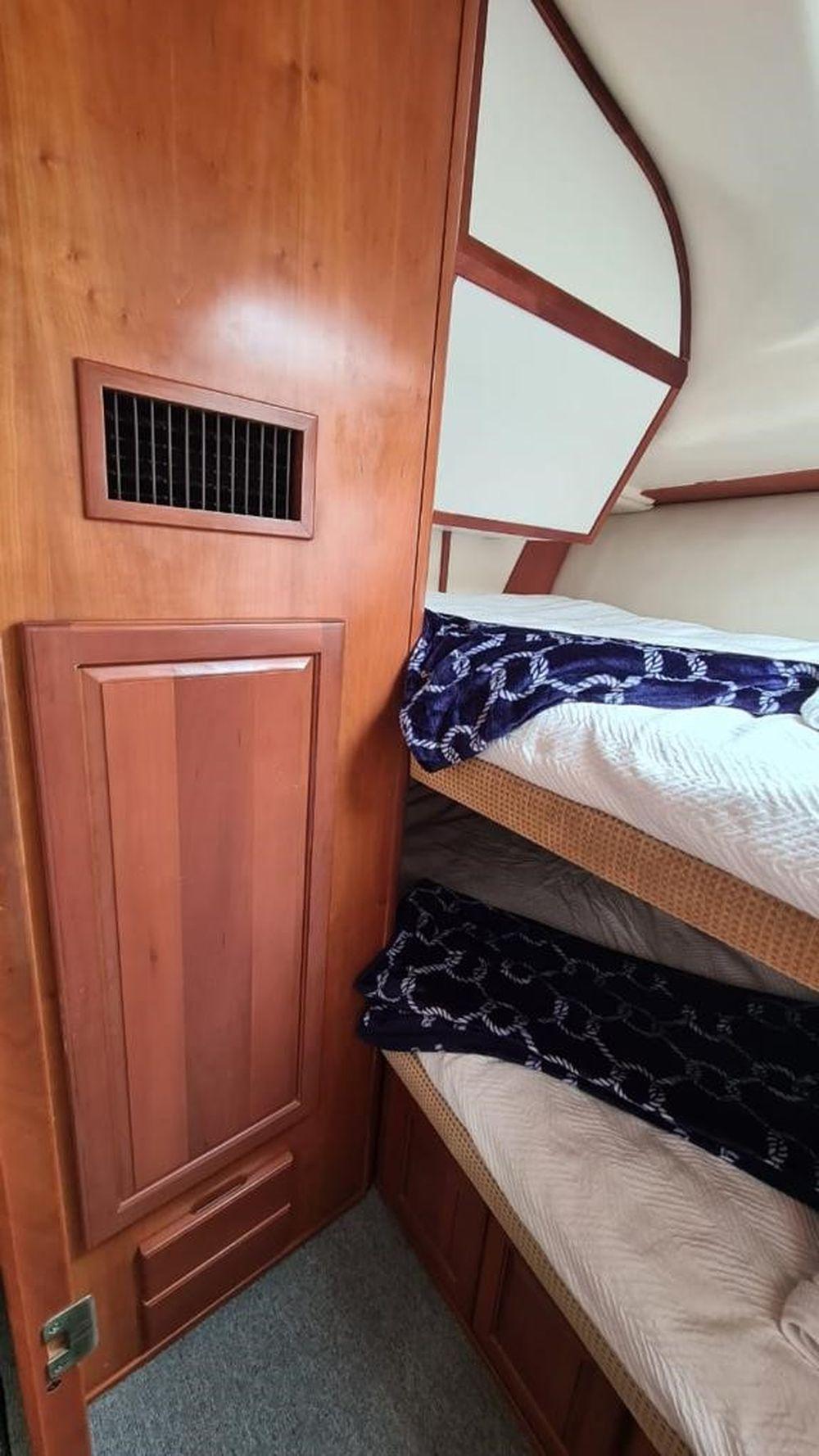 VIP Stateroom Cherry Finish, Cedar Lined hanging locker- lighted, two over and under beds each with plush mattress and reading lights. Storage under bed for rods and equipment.