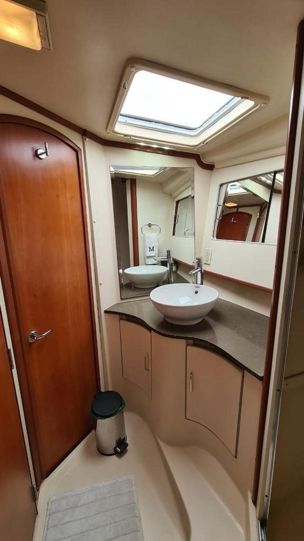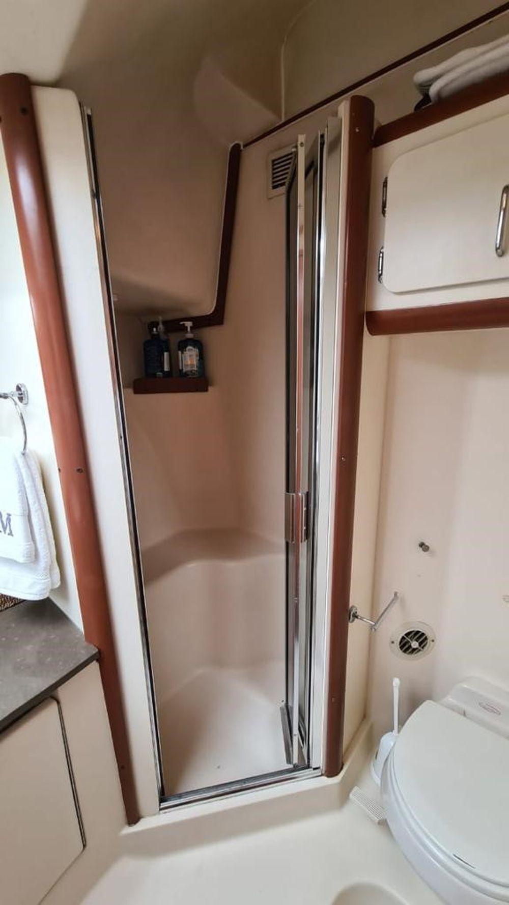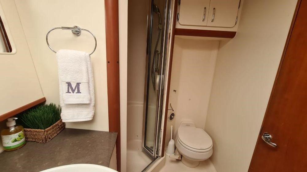 1 full size Head, Electric Head with Macerator, 30-Gallon Holding Tank and Overboard Discharge, Flush-Mounted Overhead Ventilation Hatch, Molded Fiberglass Cabinet Under Vanity, Separate Stall Shower w/Bi-Fold Door