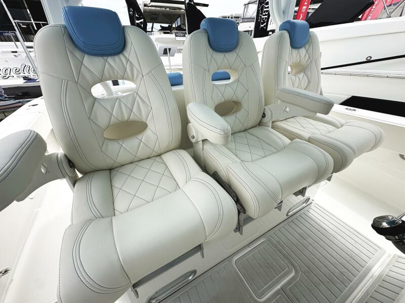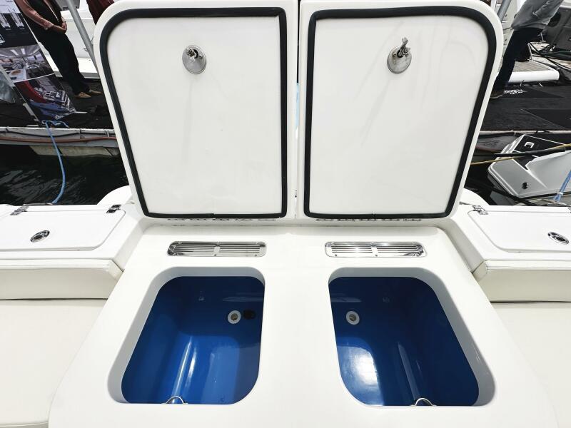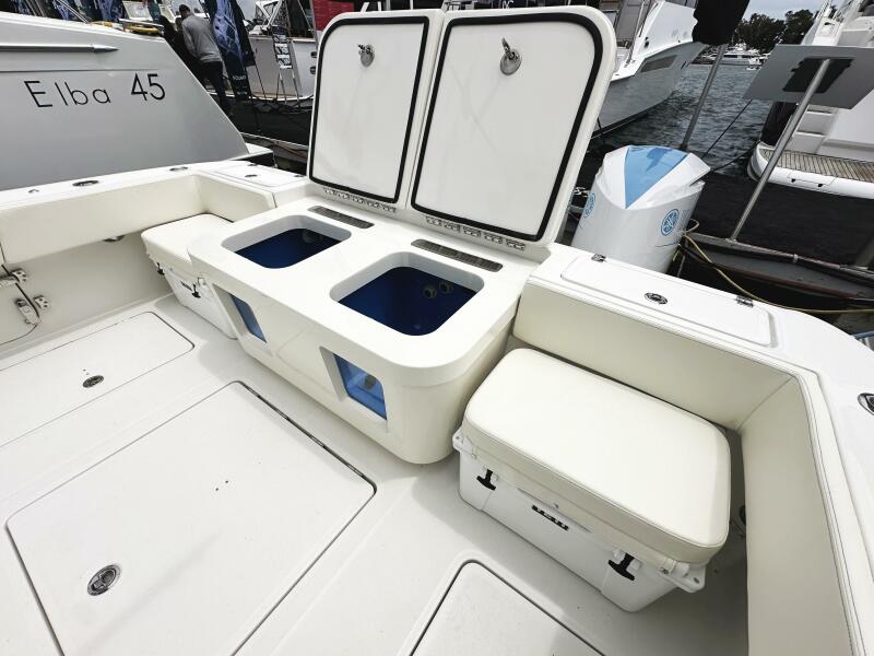 The aft cockpit includes two 40 gallon pressurized livewells, tackle and storage compartments, rod holders, and cushioned seating for two.