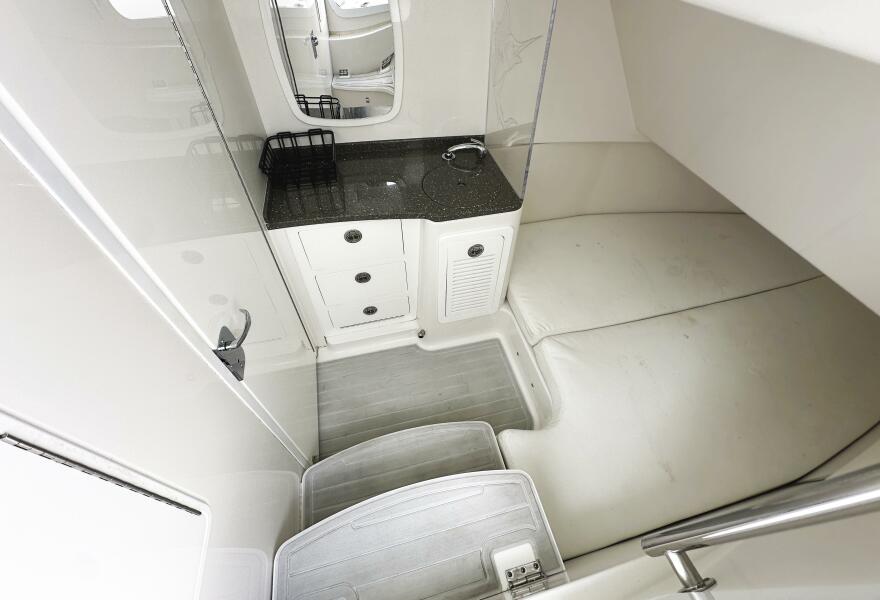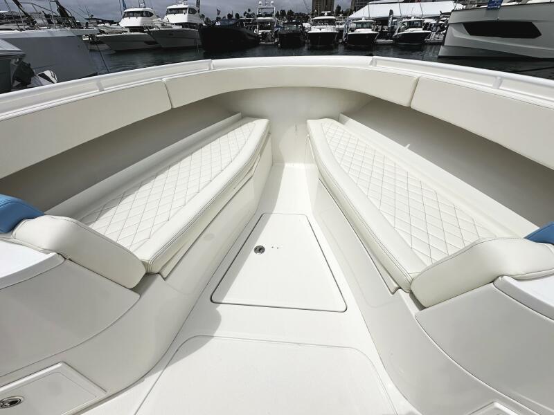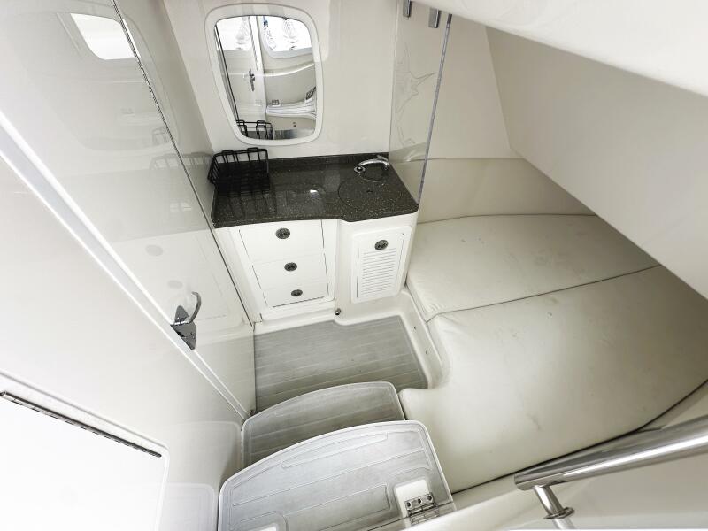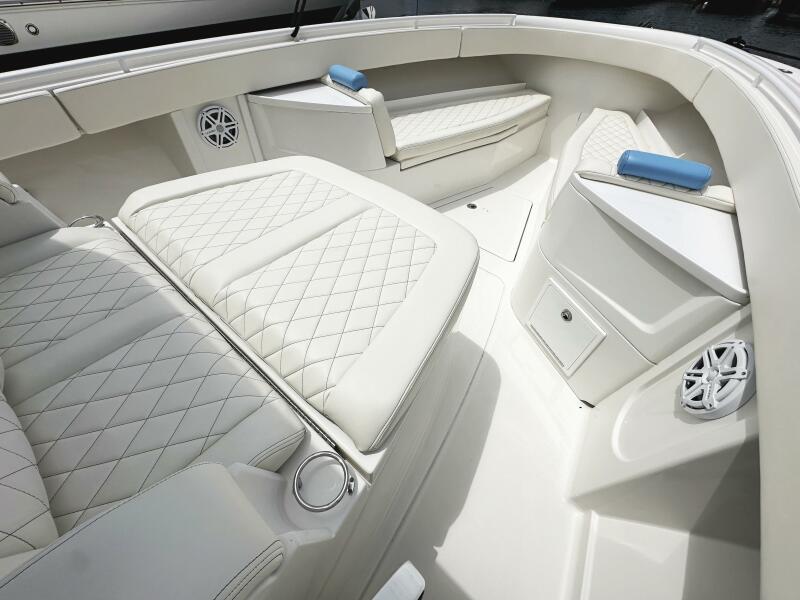 Powered by Triple Yamaha F35’s, TRIPLE J is rated at a top speed of 58mph @6000 RPM’s. The huge helm accommodates a 16” and two 12” Garmin MFD’s, Fusion stereo system, bow thruster, cup holders and a full instrumentation panel. With room for three at the helm, you’ll keep dry and protected under the extra-large hardtop and curved windshield. The contoured seating throughout will help to keep you from sliding when the Speciale accelerates or turn on a dime. The forward area features multiple chaise lounges and in the aft cockpit another lounge behind the helm seats can accommodate up to three. Below you’ll find a double berth, sink, storage, and a private head.