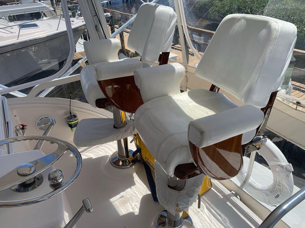- 2 x Release Marine teak helm chairs w/large pedestals & foot rest