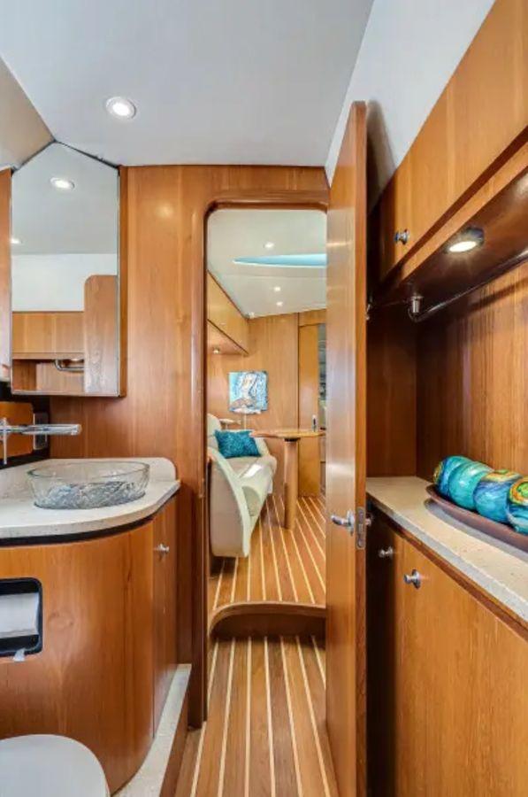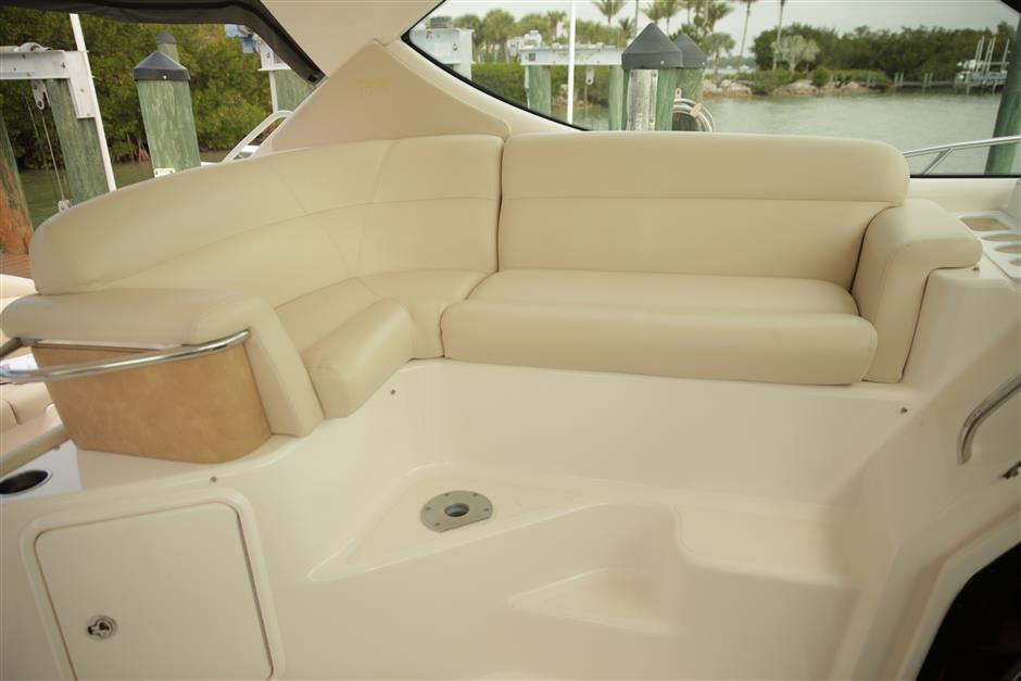This Sovran continues the Tiara Yachts tradition of quality and engineering that takes full advantage of Volvo IPS technology – including the new IPS joystick control – for superior handling, noise and fume reduction, and fuel efficiency. The full complement of IPS technology delivers 360-degree direction control at your fingertips. By utilizing the space advantages of the IPS drive in a single stateroom layout, Tiara Yachts designers have been able to open up the salon and increase the size of the head, including a full-frame door and stall shower. The extra space is also put to practical use in a step-down “theater” lounging area. The 3900 Sovran is a uniquely livable single-stateroom floor plan that’s ideal for cruising. Its living space is well thought out and fitted out with traditional Tiara Yachts attention to quality, seaworthiness and lasting value.
