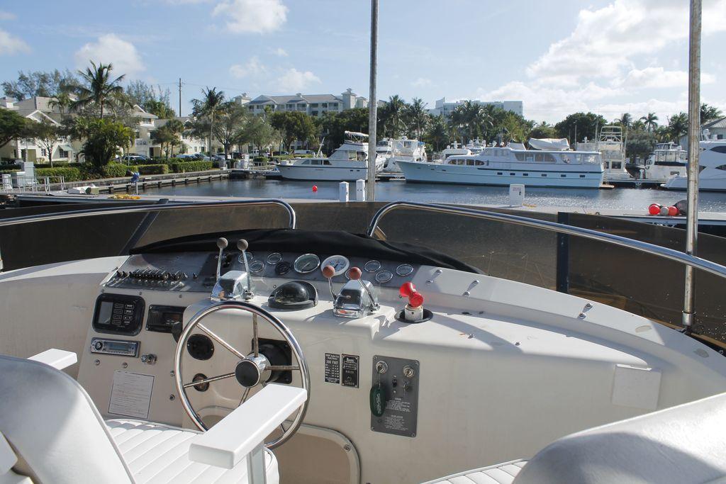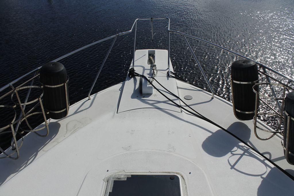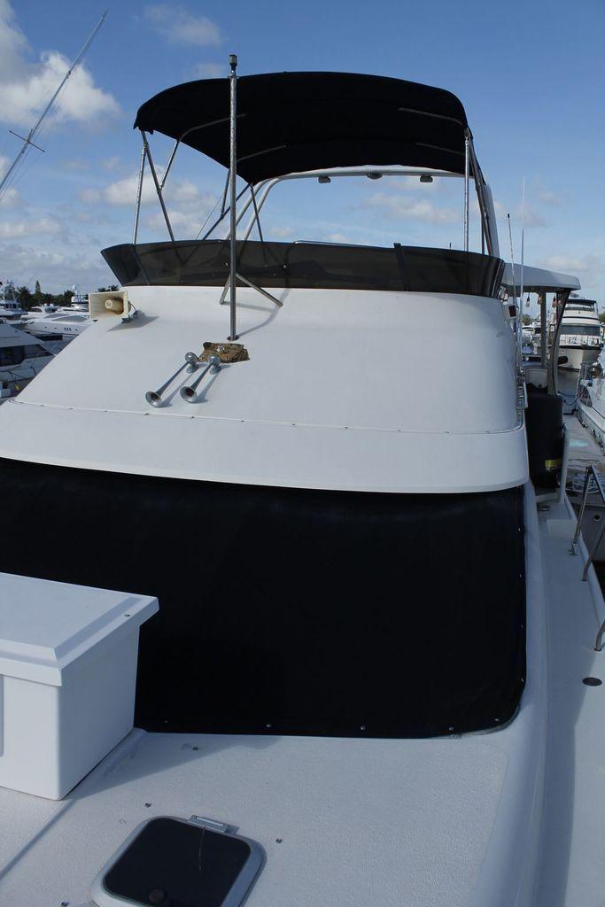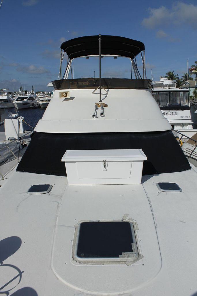 Molded FRP decks, coamings, bulwarks and flybridge. Non-skid surface on all weather decks. SS safety bow rails and hand rails as required. Molded toe rails and anchor pulpit. The aft deck is fitted with a FRP hard top and the flybridge is fitted with a SS frame Bimini top. Molded mechanically attached anchor pulpit with roller. Aft deck with service wet bar. Aluminum radar arch on flybridge. Steps up to flybridge with helm station, helm chairs. Aluminum frame safety glass windows. 3 hatches on foredeck. Sliding companionway door.