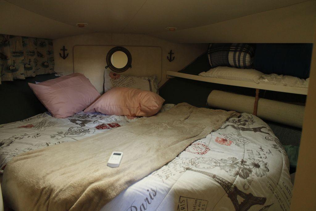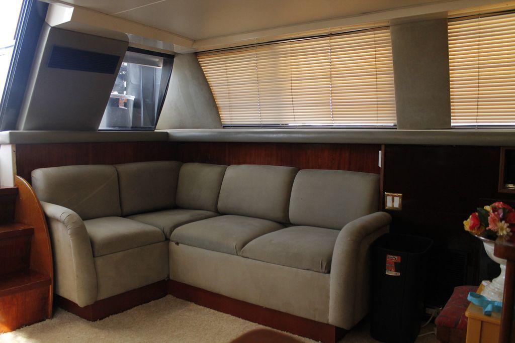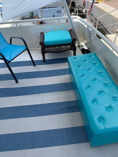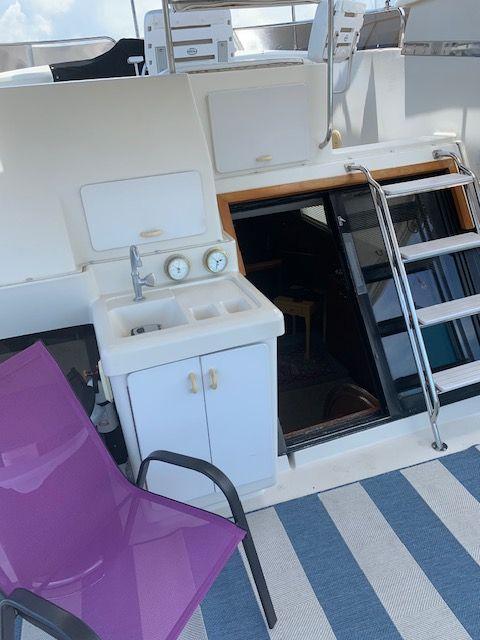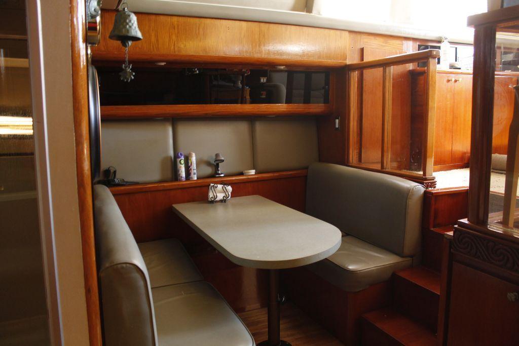 Double cabin forward with storage and hanging locker. Bright wood, vinyl and Mica trim and appointments throughout. The bright wood is in very good condition. Dual access to enclosed head with sink, shower and electric MSD fitted as per USCG requirements. New custom cabinetry in Stbd saloon. Aft to galley with SS sink and conventional appliances. Dinette to Stbd. Steps up to main saloon with seating, entertainment center. Steps down to owner’s cabin with double berth, enclosed head with sink, shower and MSD fitted as forward. Very clean and well maintained.