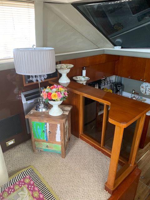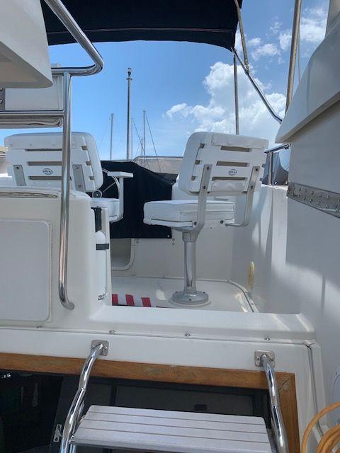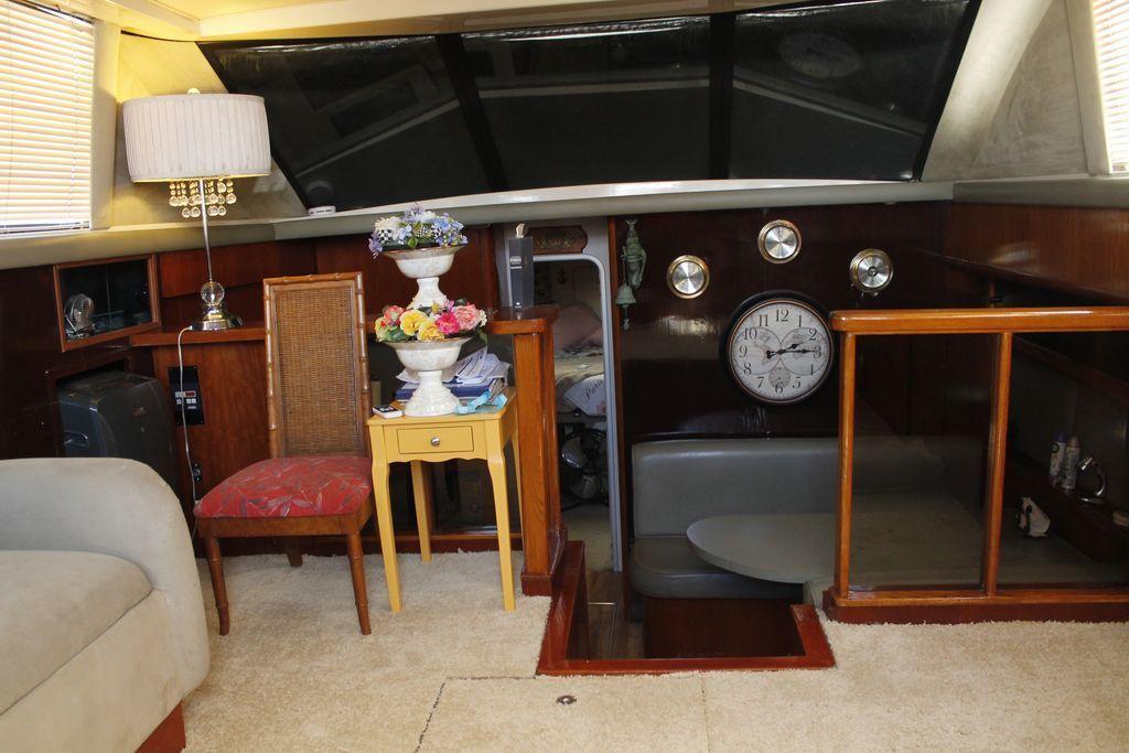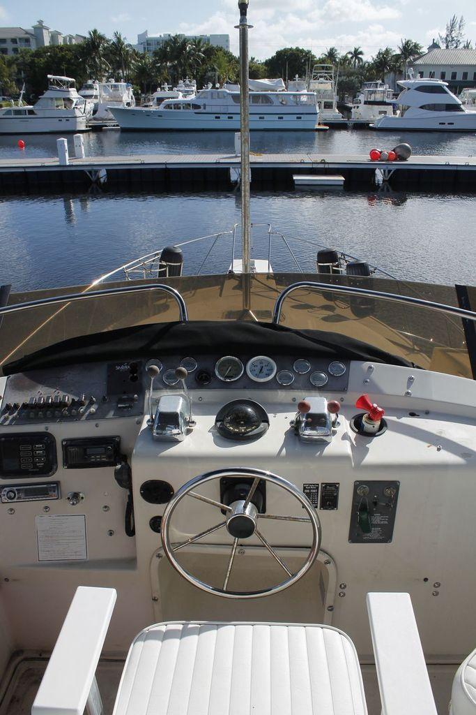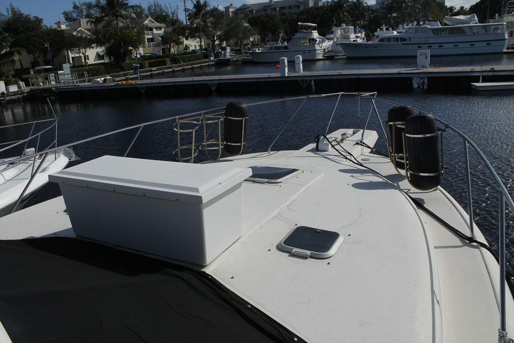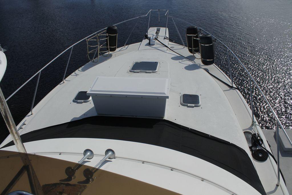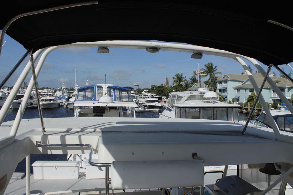 Molded FRP decks, coamings, bulwarks and flybridge. Non-skid surface on all weather decks. SS safety bow rails and hand rails as required. Molded toe rails and anchor pulpit. The aft deck is fitted with a FRP hard top and the flybridge is fitted with a SS frame Bimini top. Molded mechanically attached anchor pulpit with roller. Aft deck with service wet bar. Aluminum radar arch on flybridge. Steps up to flybridge with helm station, helm chairs. Aluminum frame safety glass windows. 3 hatches on foredeck. Sliding companionway door.