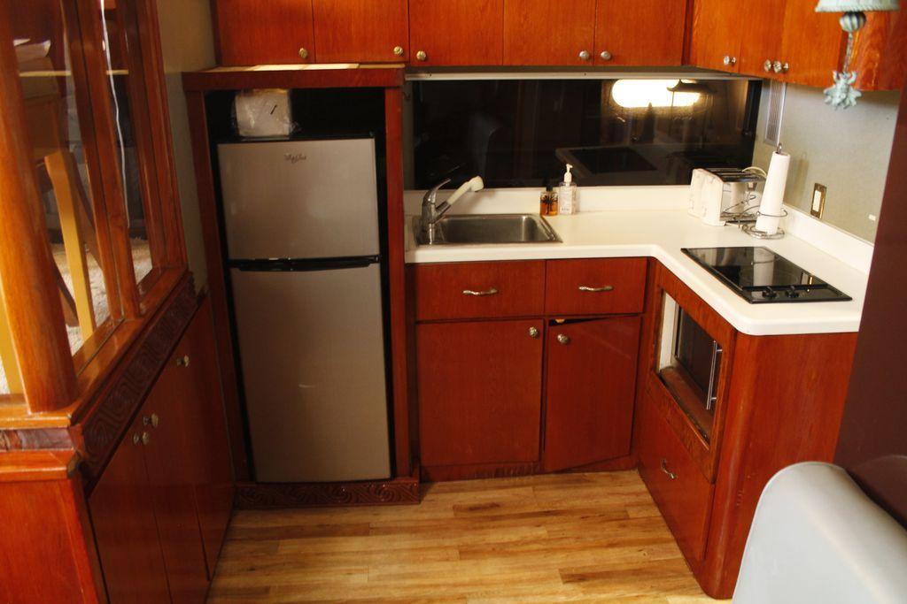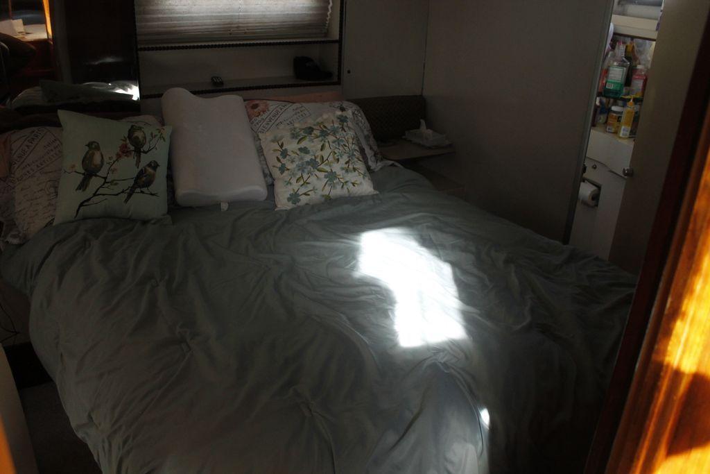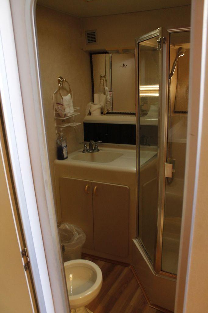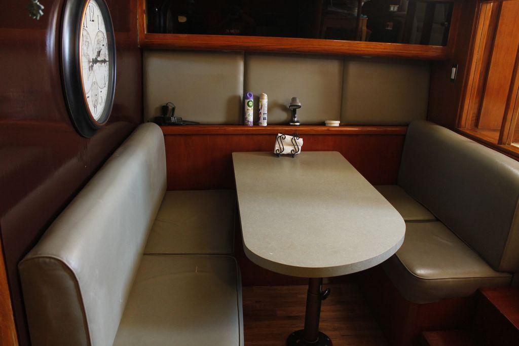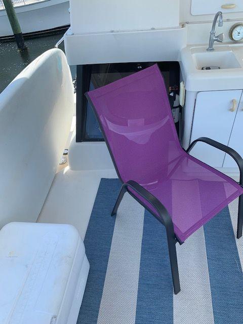 Double cabin forward with storage and hanging locker. Bright wood, vinyl and Mica trim and appointments throughout. The bright wood is in very good condition. Dual access to enclosed head with sink, shower and electric MSD fitted as per USCG requirements. New custom cabinetry in Stbd saloon. Aft to galley with SS sink and conventional appliances. Dinette to Stbd. Steps up to main saloon with seating, entertainment center. Steps down to owner’s cabin with double berth, enclosed head with sink, shower and MSD fitted as forward. Very clean and well maintained.