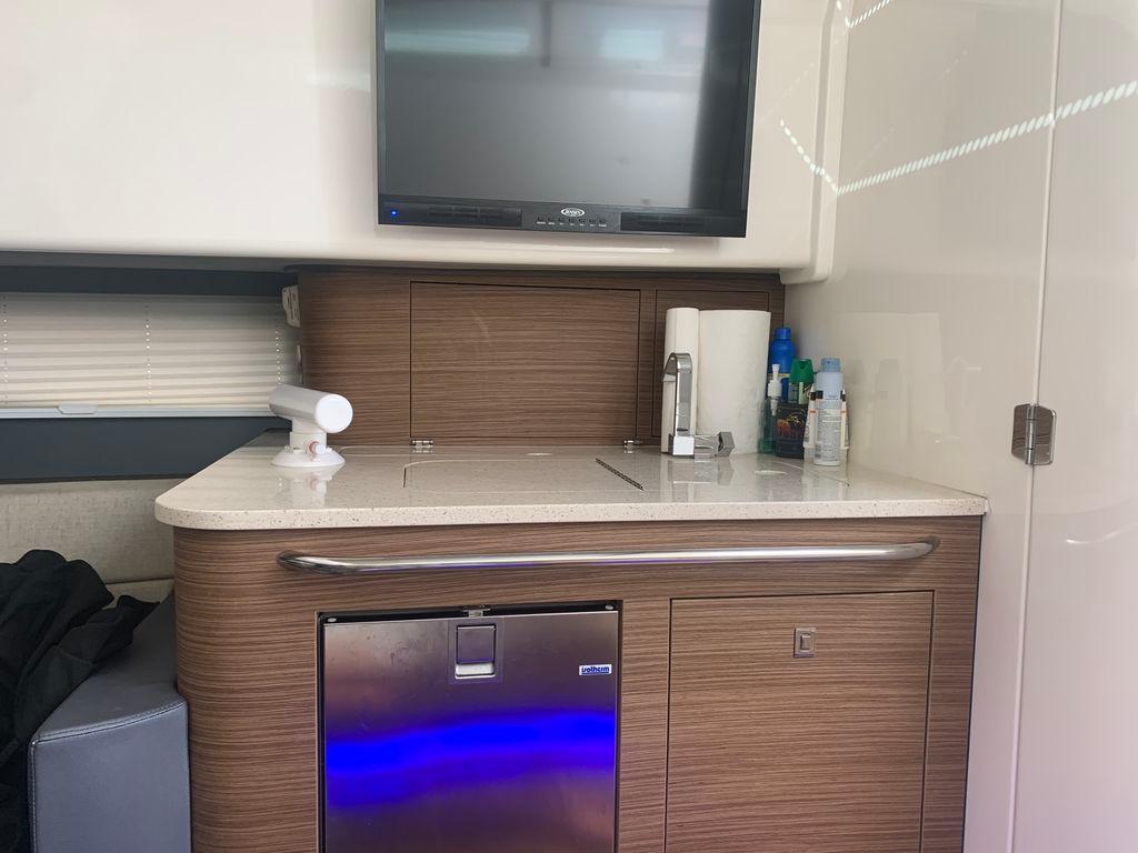 - Refrigerator – stainless steel drawer 12–V/120–V (2.3 cubic ft) (starboard side)