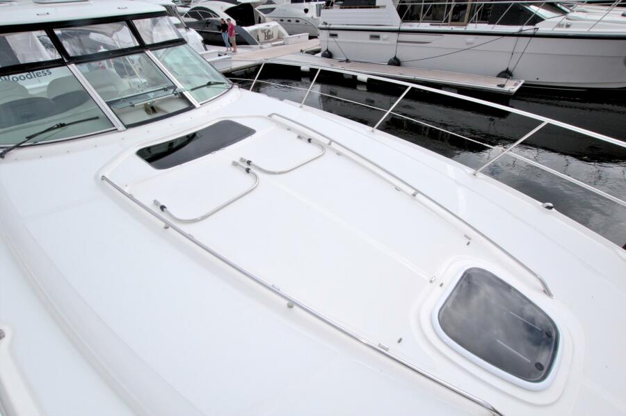 On the exterior, the Sea Ray 44 Sundancer stands out with its Mediterranean-inspired design, featuring a fiberglass hardtop, underwater exhaust, and spacious cockpit for entertaining. The yacht includes an integrated swim platform, hydraulic engine access, and plenty of storage space for gear. The large cockpit features premium seating, including a U-shaped aft seating area, wet bar, and cockpit table, making it the perfect spot for relaxation and socializing.