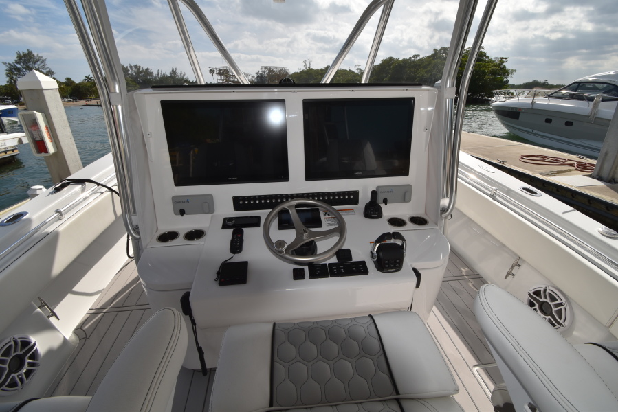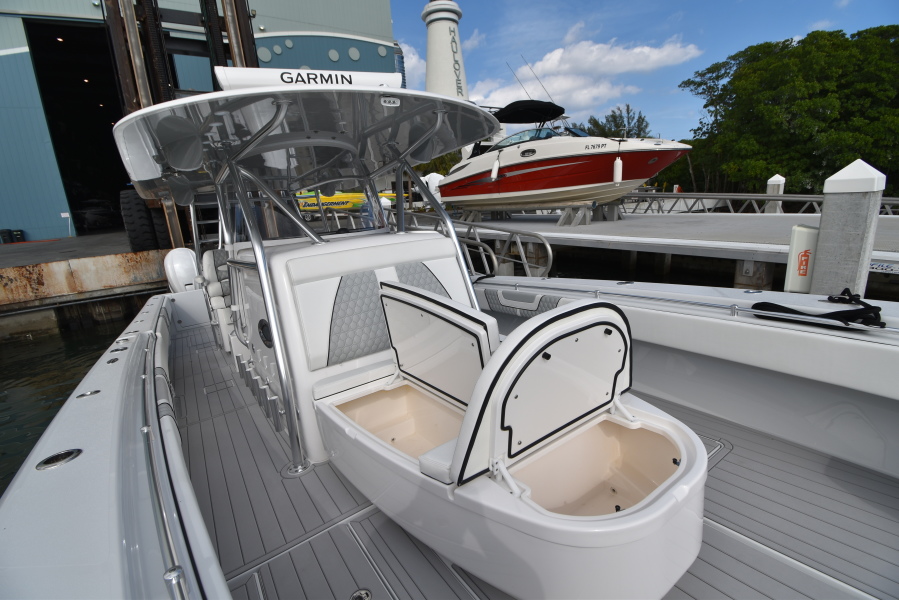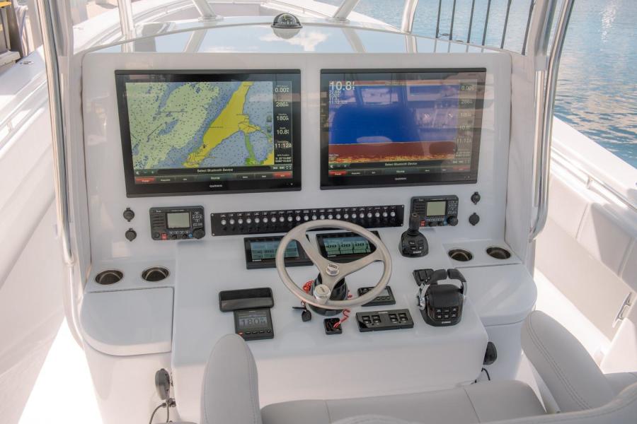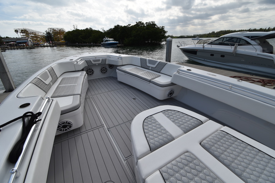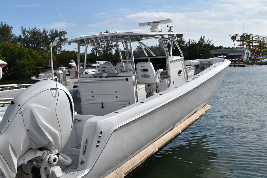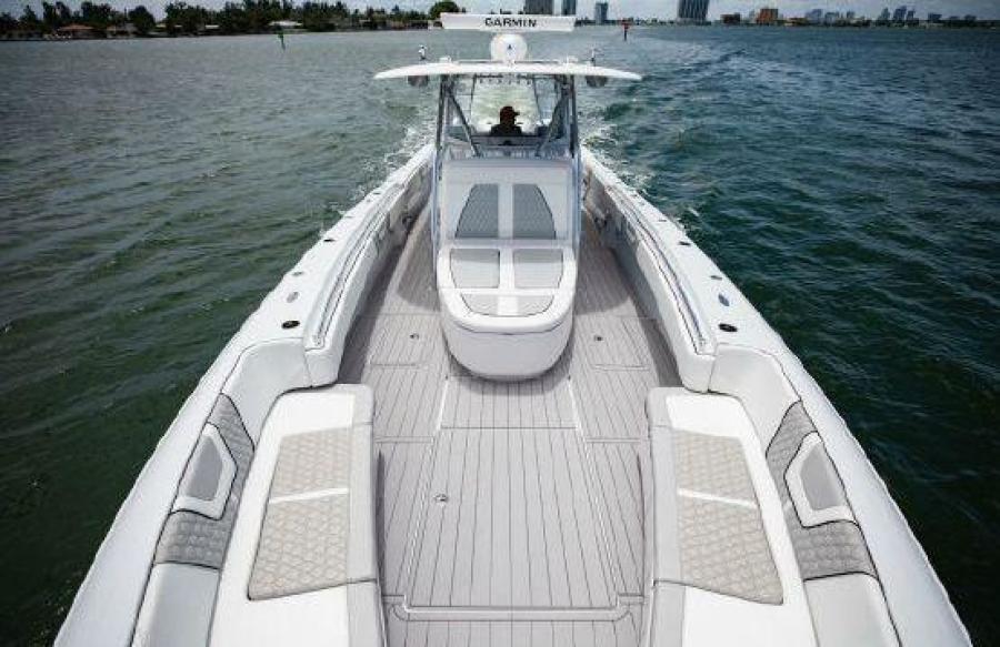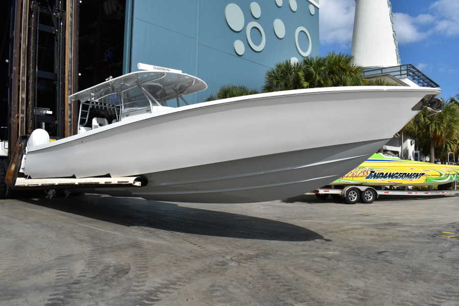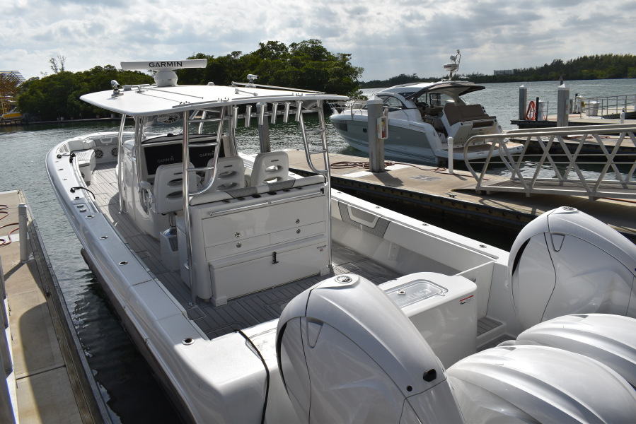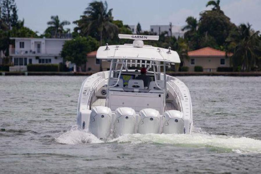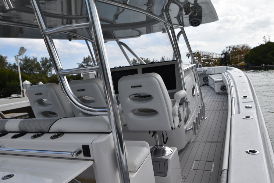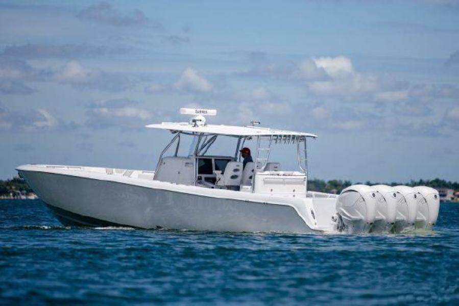 Nearly New and Lightly Used, this 44 Contender is available for immediate delivery. The largest model produced by Contender with a 12' beam and powered with quad Yamahas @425 hp each the boat excels in speed, performance, and reliability. This boat is loaded since it was the Contender demo boat.