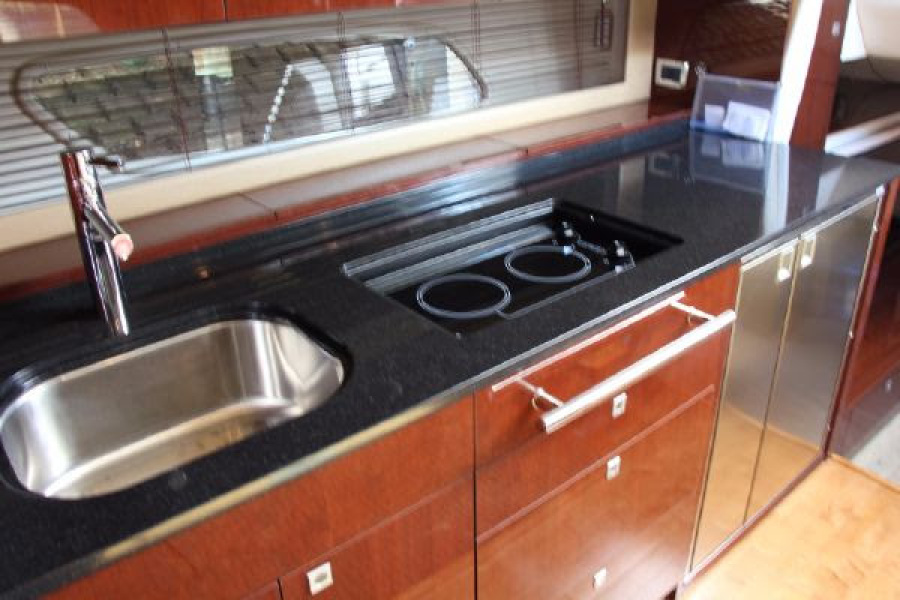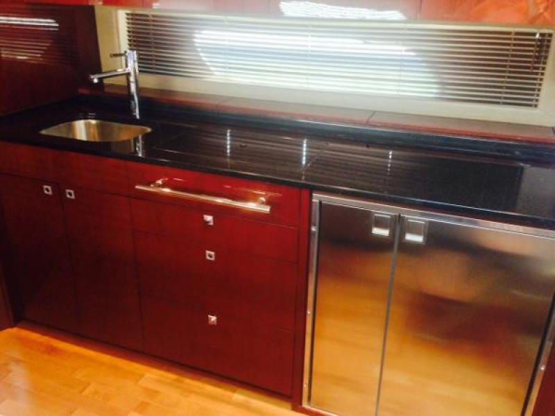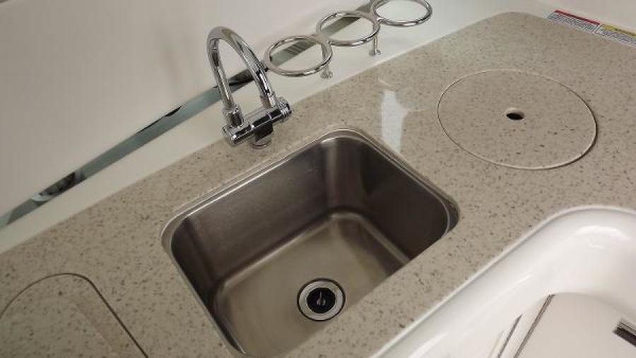 - Cockpit wet bar with sink and faucet, solid-surface countertop, stainless-steel handrail, trash receptacle, and storage cabinet