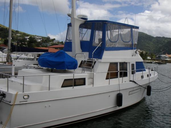 Outside and up on the flybridge there is very comfortable seating for your guests and family with a table perfect for al fresco dining. The pilot of your fine yacht will have great visibility from the helm seat. Complete electronics are at one’s fingertips. While underway, you can roll up the enclosure and feel the ocean breezes. With both bow and stern thrusters, she is easy to operate and docking is a breeze. You and your guests also have the choice of lounging on the aft cabin top as there is room here to put lounge chairs. The Steel head davit makes launching and retrieving the inflatable dinghy very easy for shore side excursions.