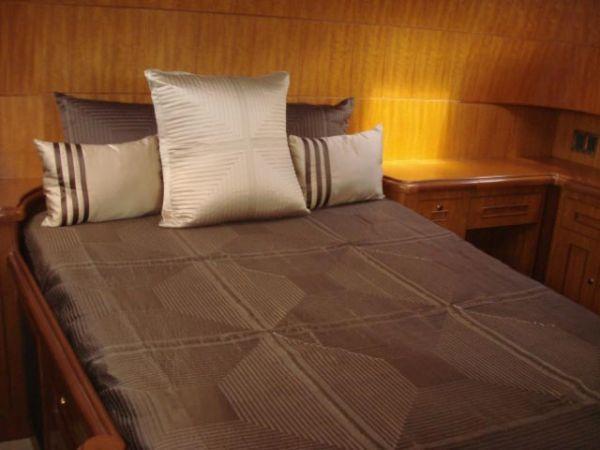 Outside and up on the flybridge there is very comfortable seating for your guests and family with a table perfect for al fresco dining. The pilot of your fine yacht will have great visibility from the helm seat. Complete electronics are at one’s fingertips. While underway, you can roll up the enclosure and feel the ocean breezes. With both bow and stern thrusters, she is easy to operate and docking is a breeze. You and your guests also have the choice of lounging on the aft cabin top as there is room here to put lounge chairs. The Steel head davit makes launching and retrieving the inflatable dinghy very easy for shore side excursions.