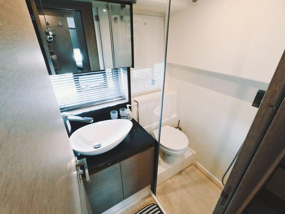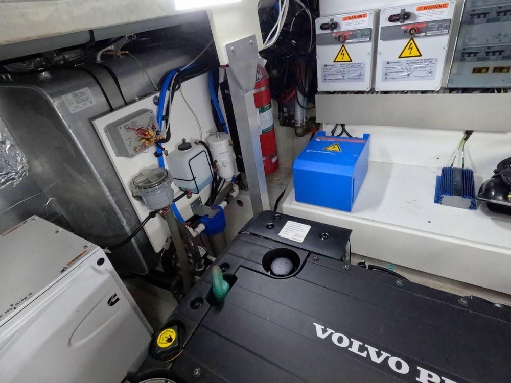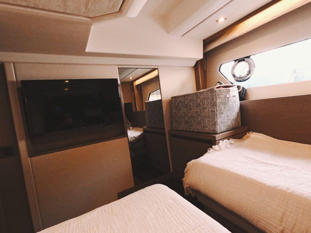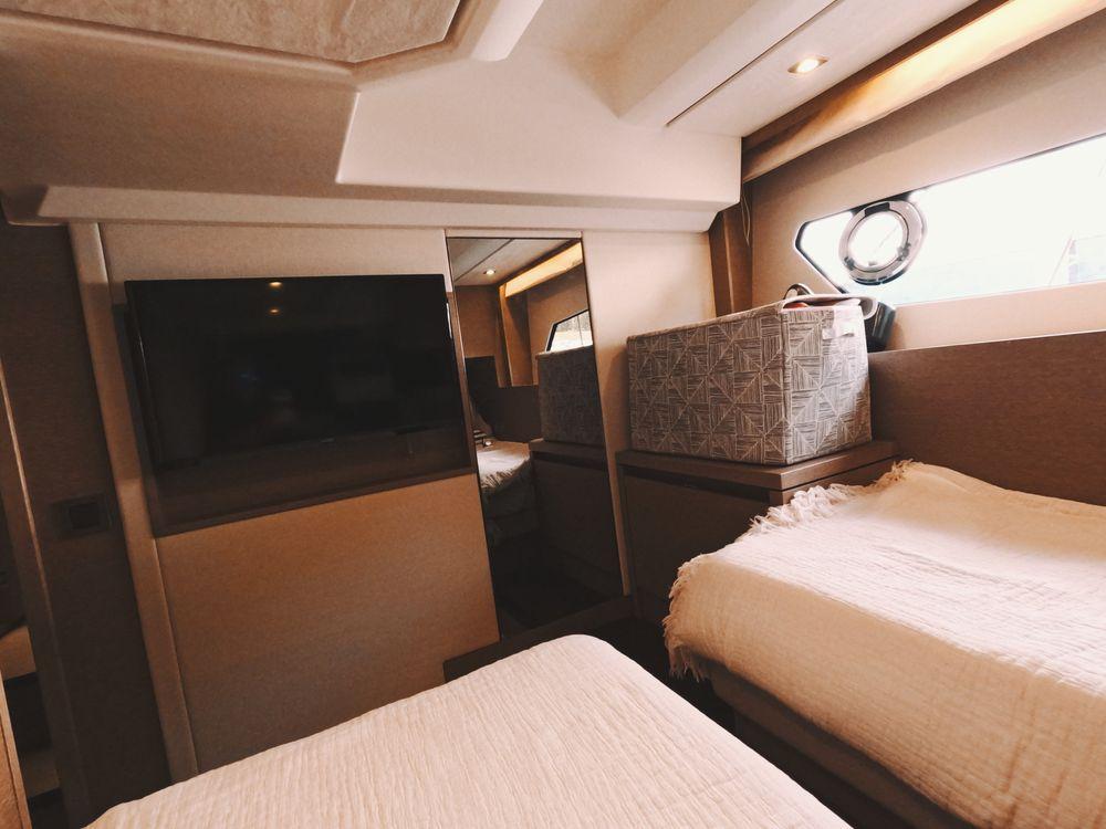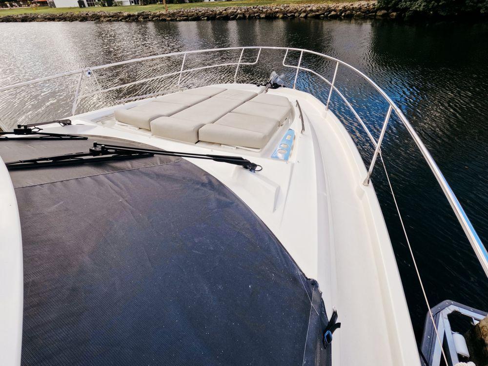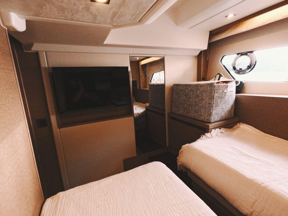 Powered by twin Volvo Penta diesel engines, this yacht offers smooth performance and efficiency. The Joystick control system ensures precise boat handling, making docking and maneuvering a breeze.