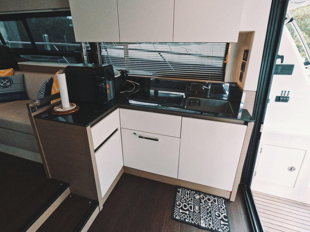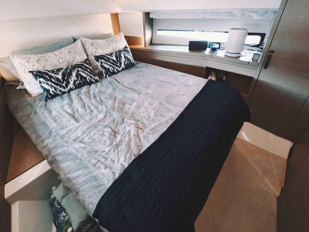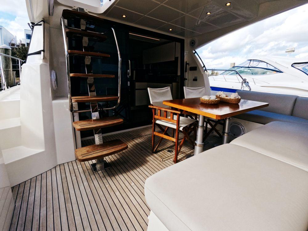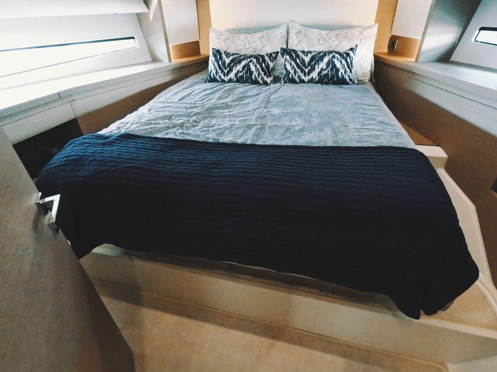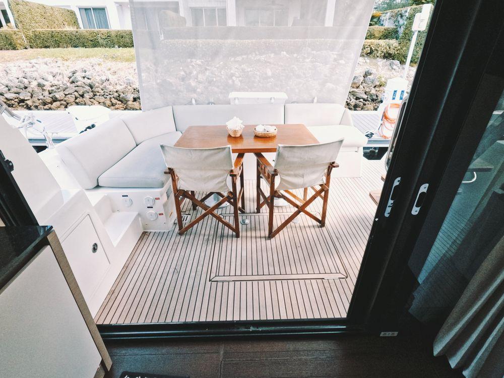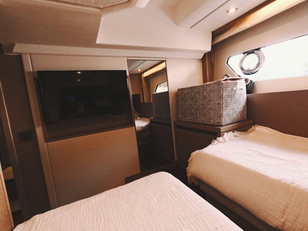 Powered by twin Volvo Penta diesel engines, this yacht offers smooth performance and efficiency. The Joystick control system ensures precise boat handling, making docking and maneuvering a breeze.