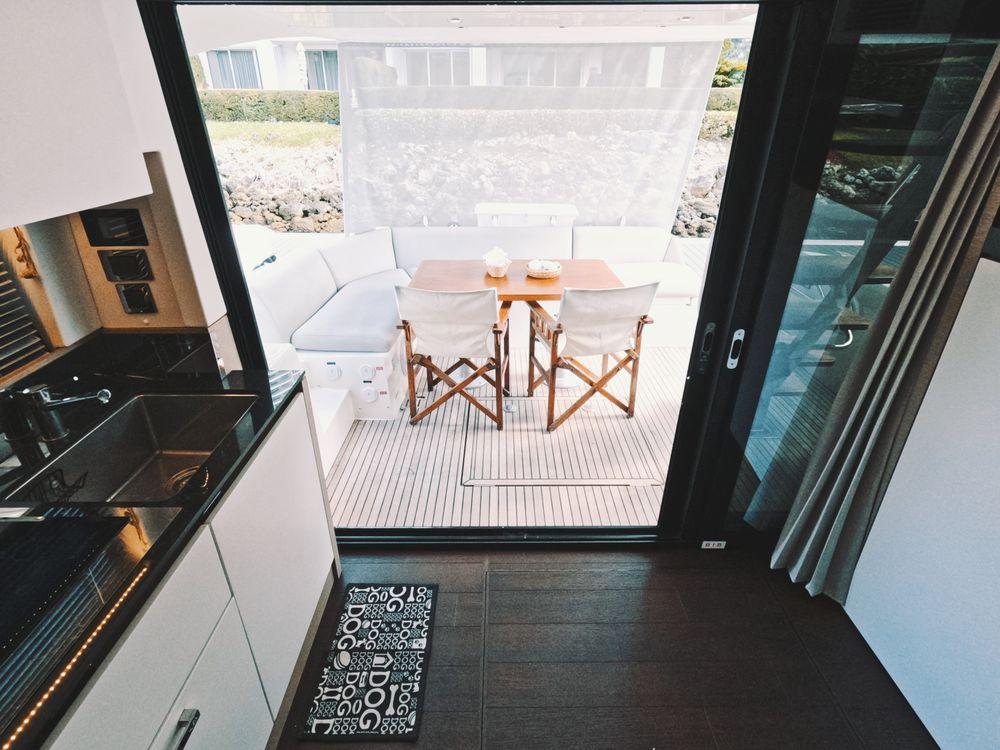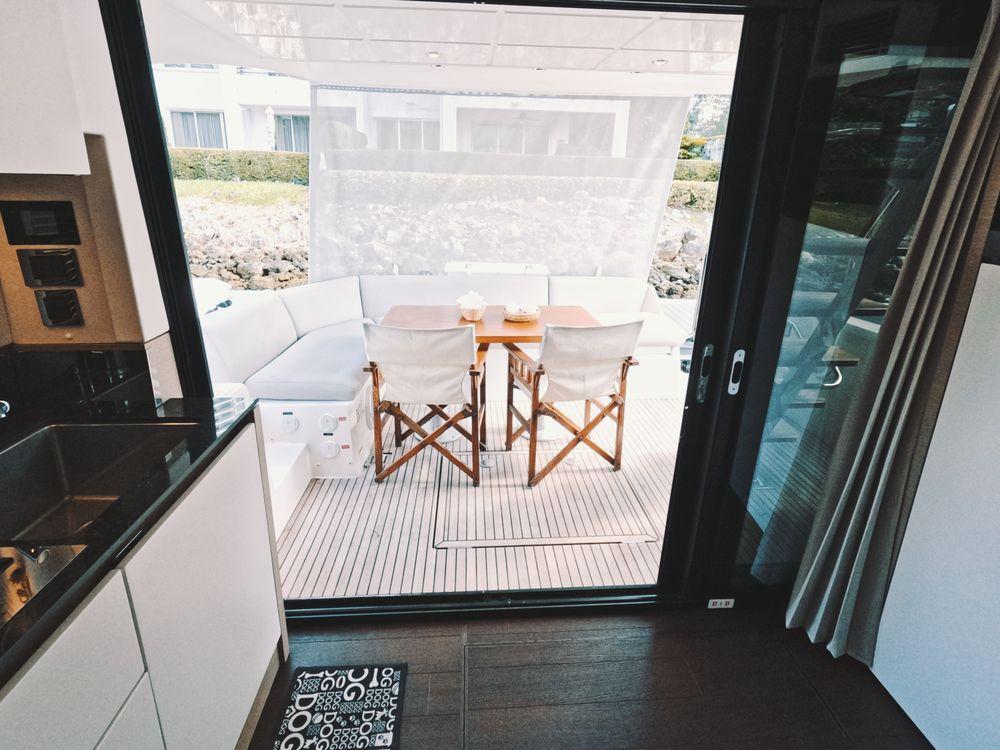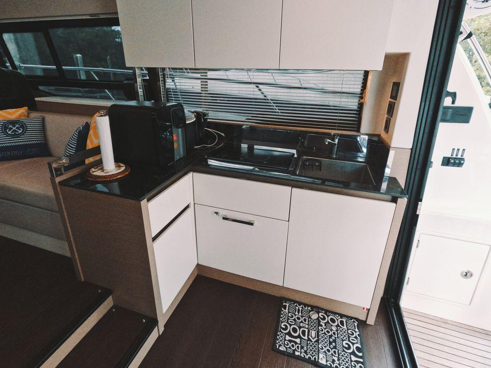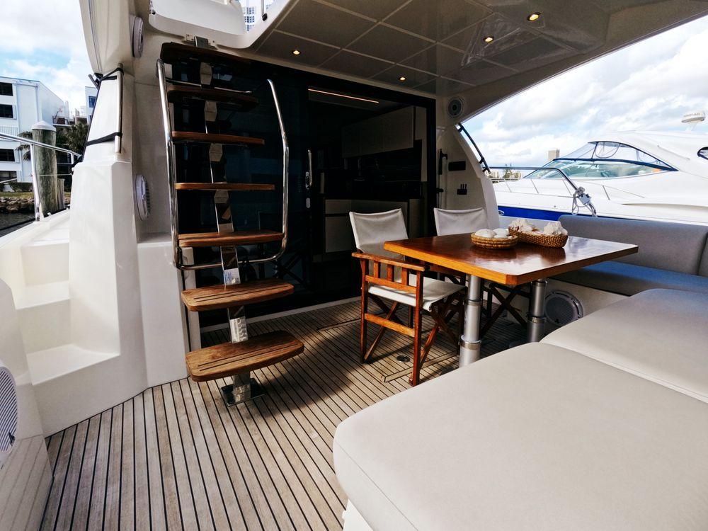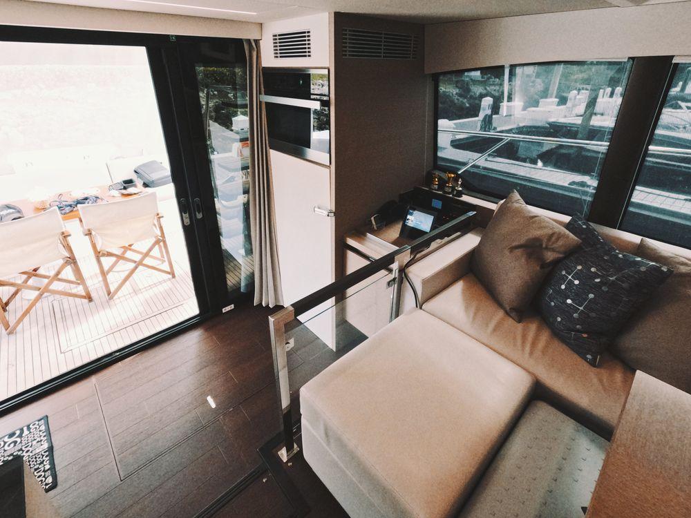 The contemporary layout of the exterior galley located to the aft opens onto an immense swim platform. The very comfortable flybridge is an invitation to complete relaxation. On board, everything has been optimized to offer unequaled space and comfort. Combining the design talents of Garroni Design and JP Concepts, this flybridge meets all the latest requirements and boasts all the benefits of a true Prestige Yacht.