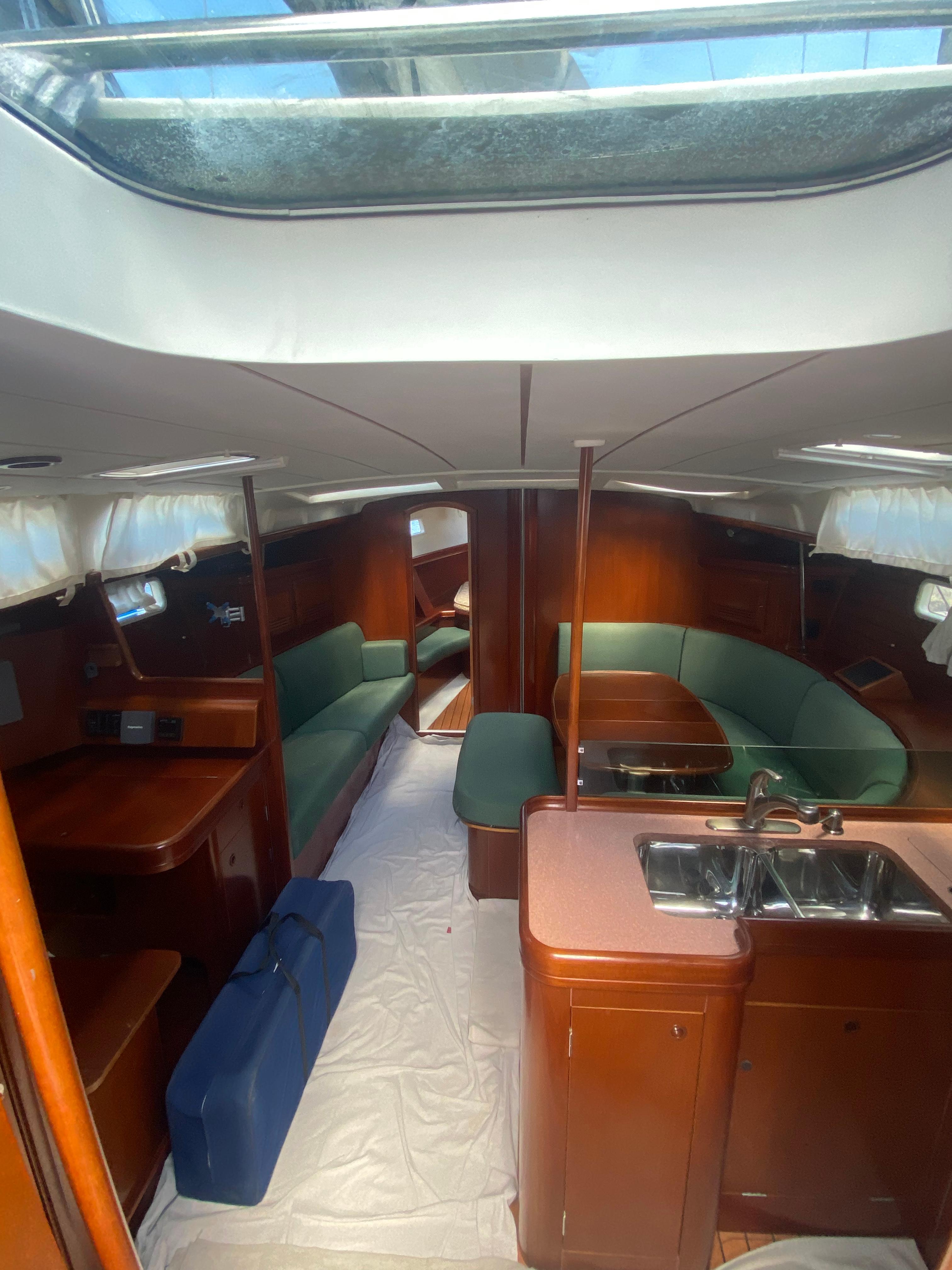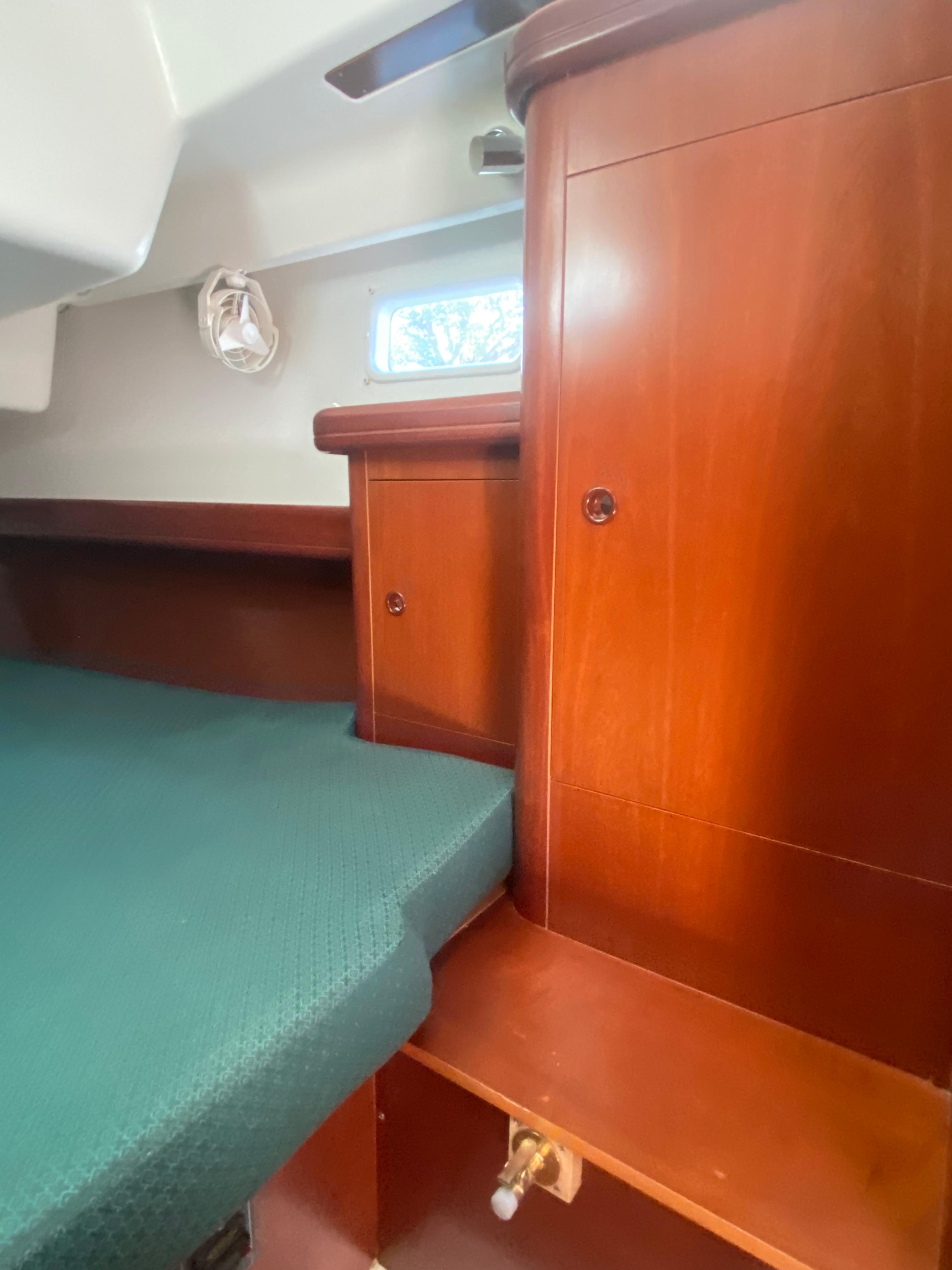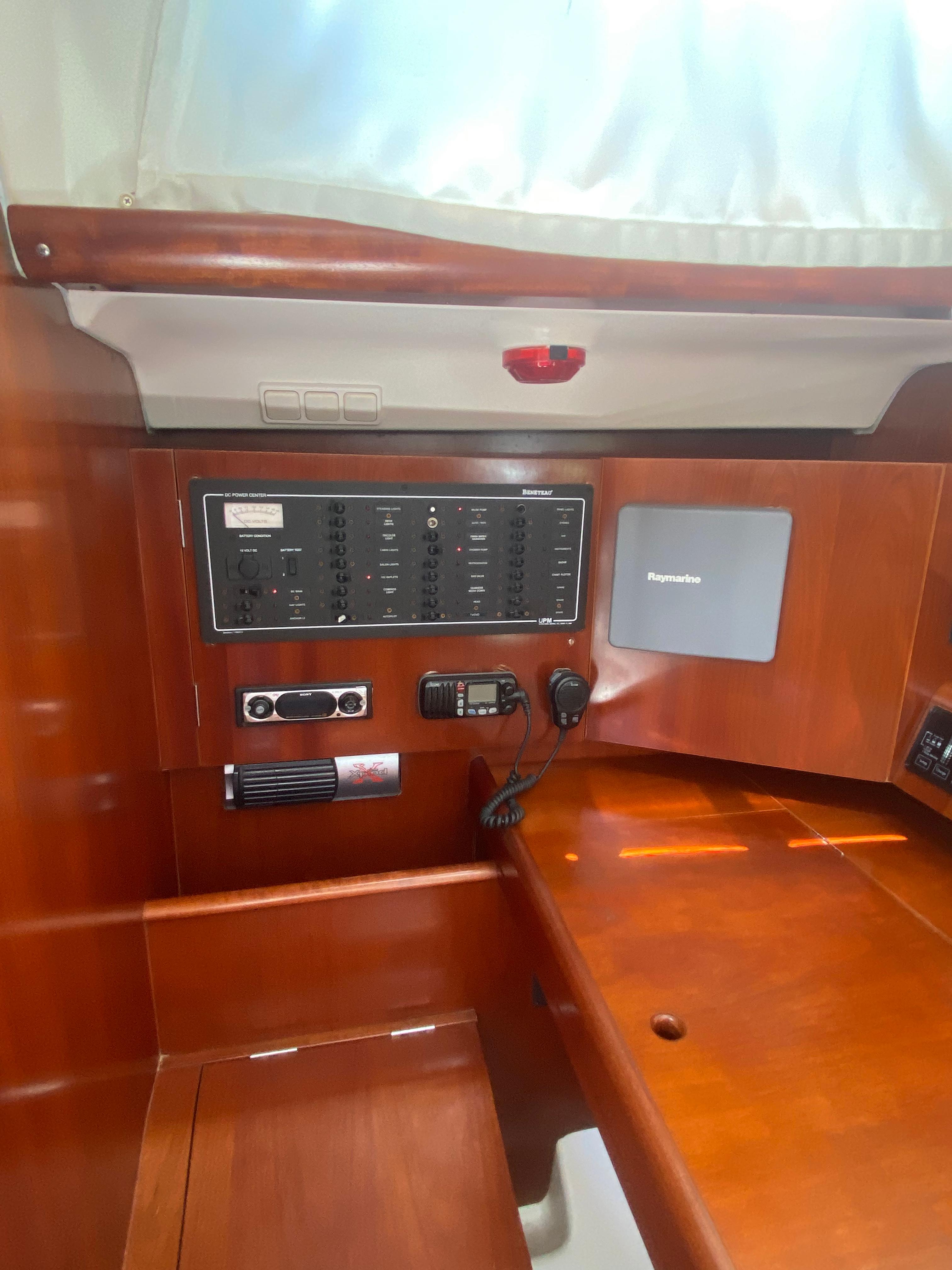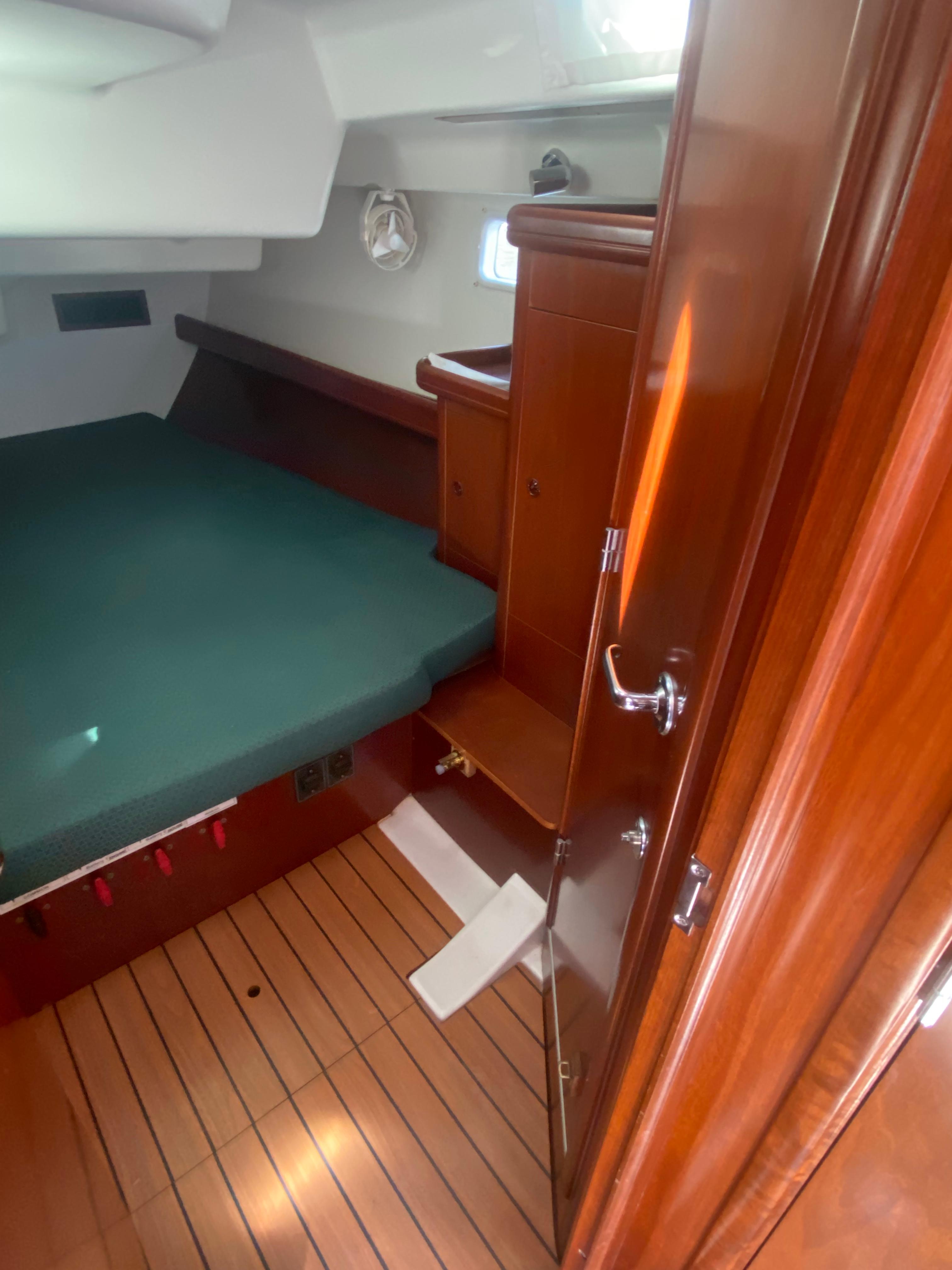 The Salon, Galley and Nav Station share an open area with the Staterooms fore and aft. Heads are forward starboard and aft to port, both with showers. Finish is cherry wood and the sole is teak and holly. Staterooms aft are large and well-lit. The āVā berth is large and has storage under it. Engine access is under the companionway steps and on either side in the aft staterooms.