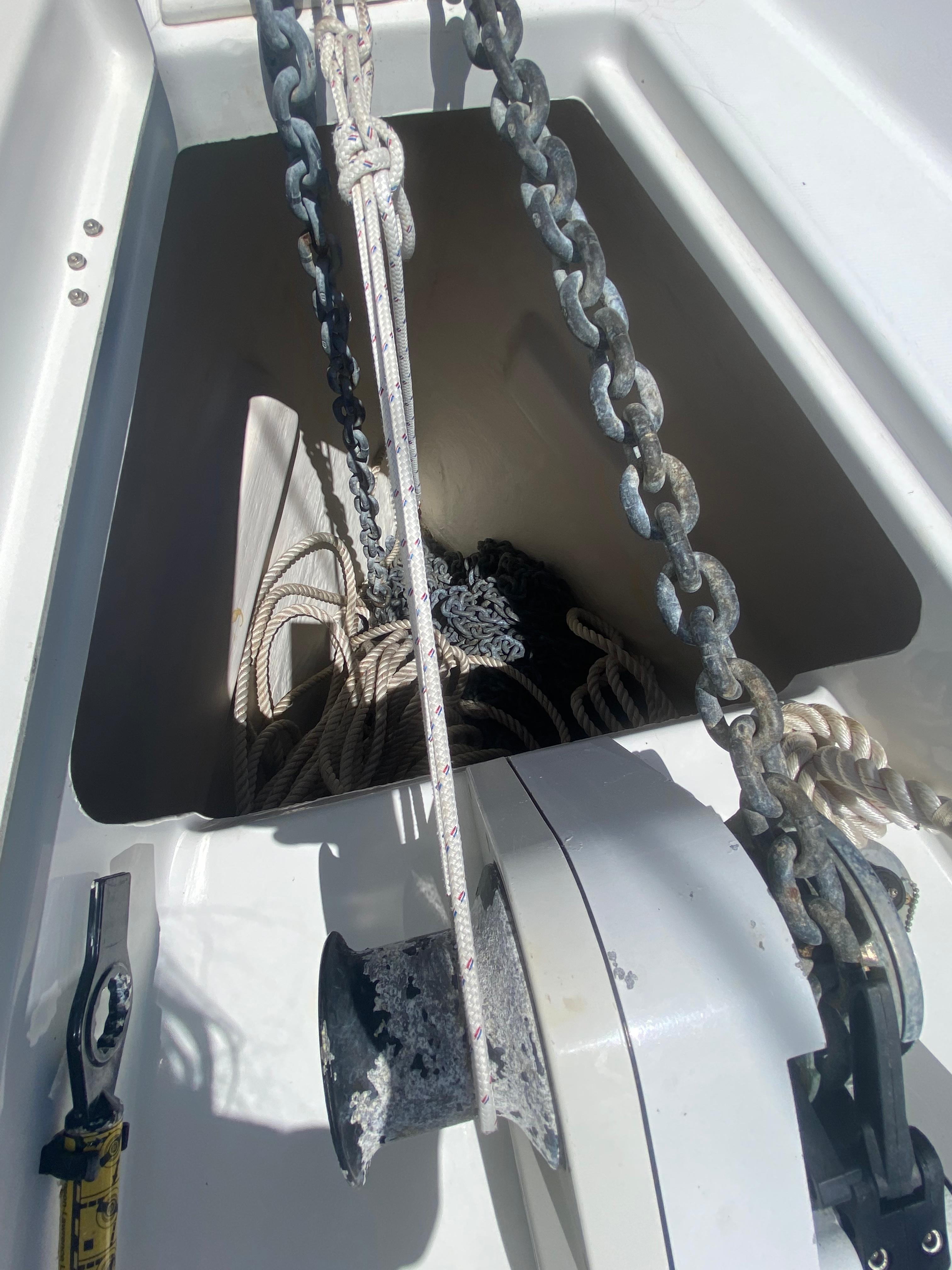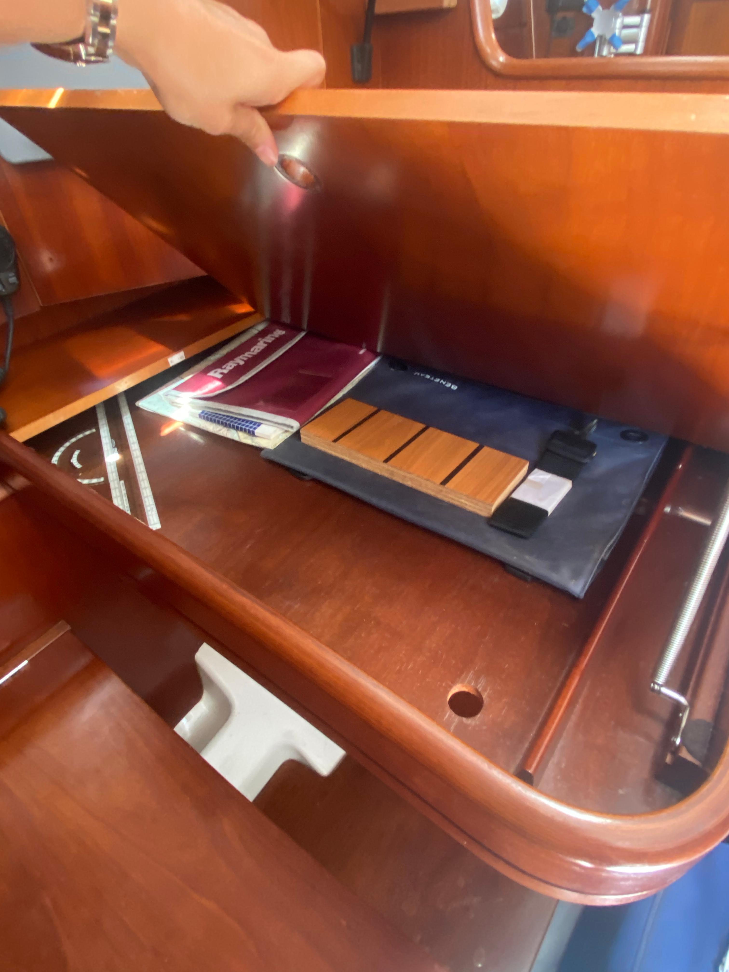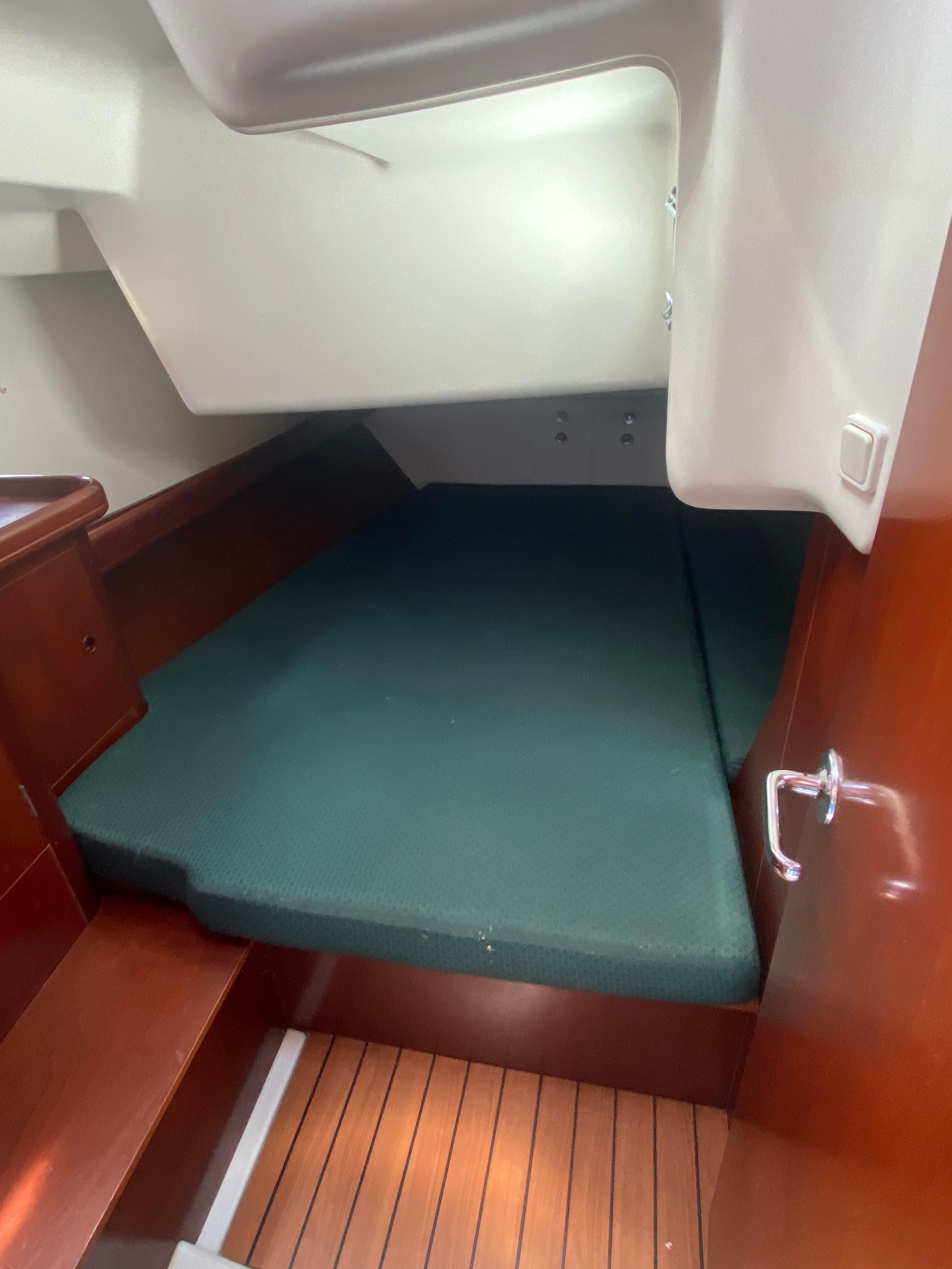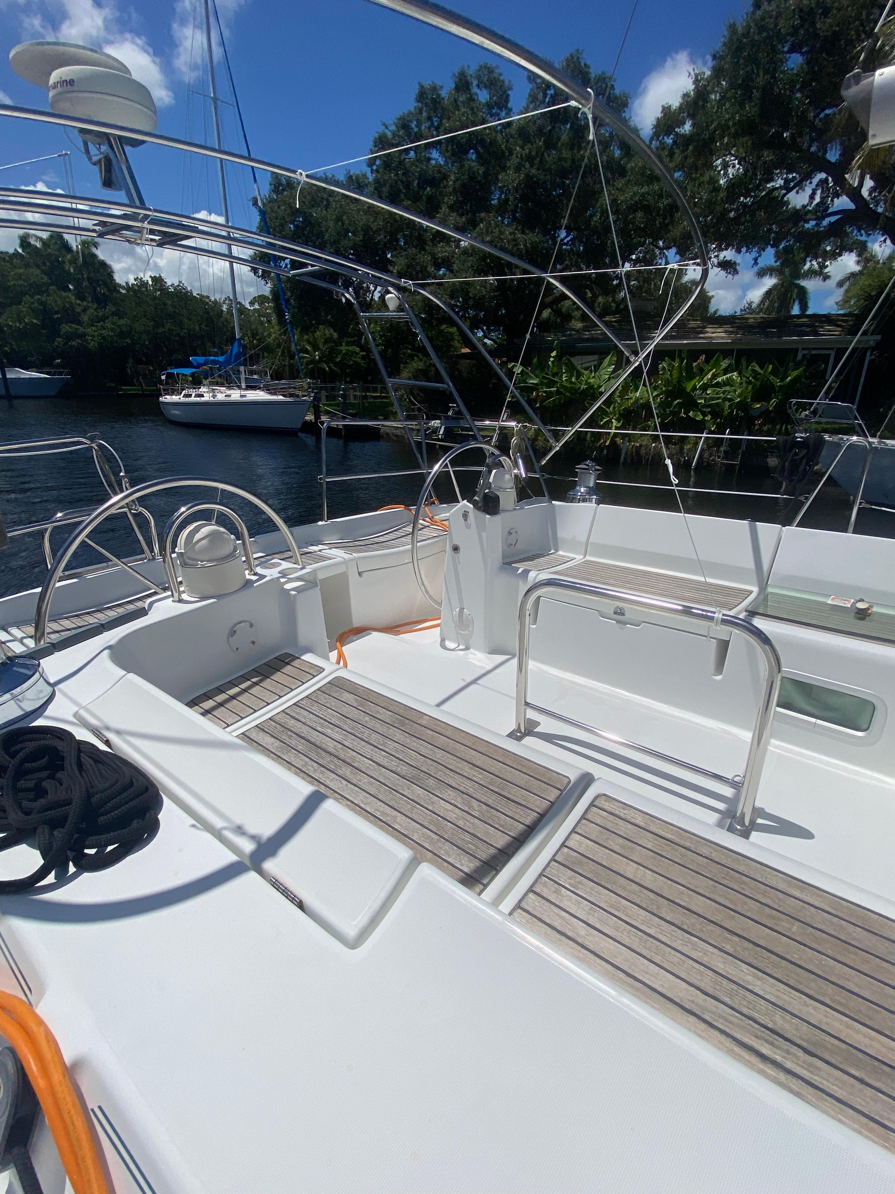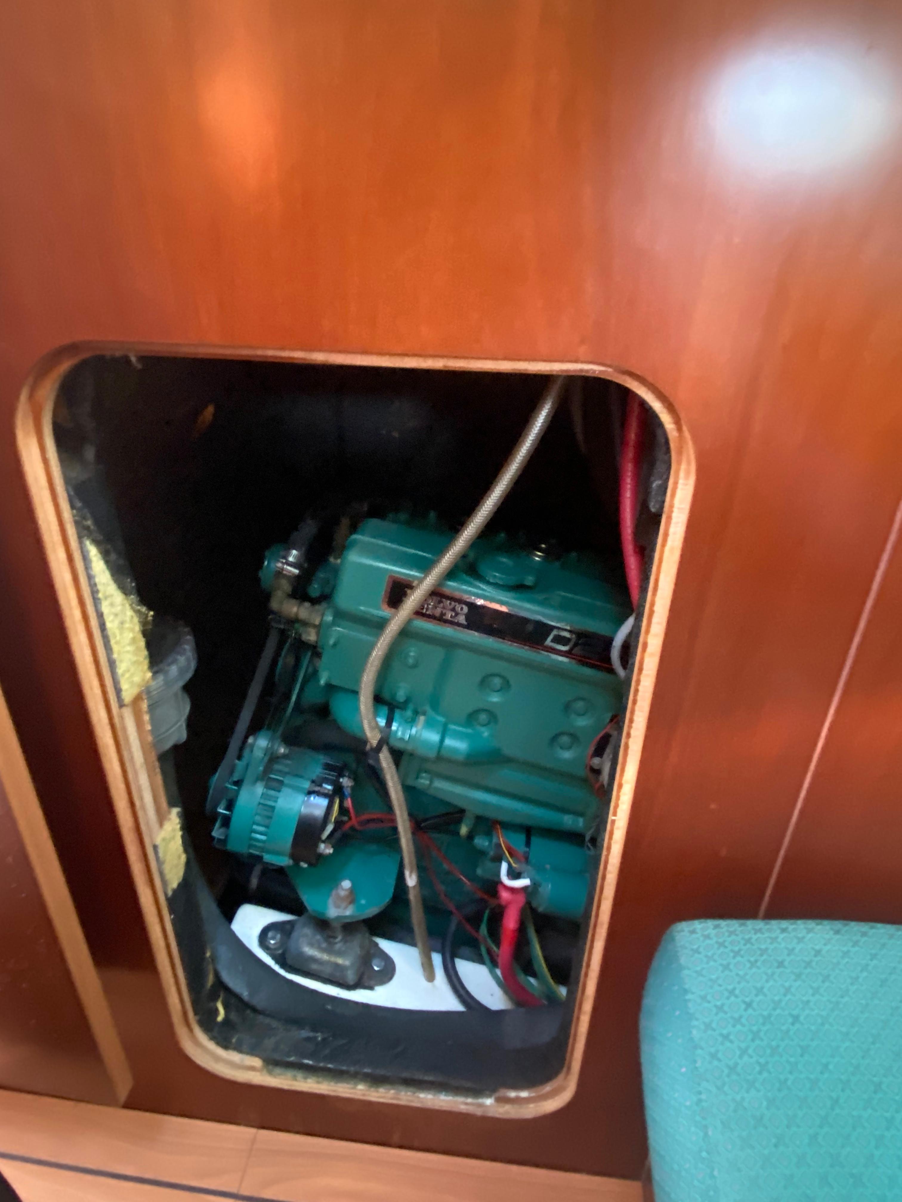 The Salon, Galley and Nav Station share an open area with the Staterooms fore and aft. Heads are forward starboard and aft to port, both with showers. Finish is cherry wood and the sole is teak and holly. Staterooms aft are large and well-lit. The āVā berth is large and has storage under it. Engine access is under the companionway steps and on either side in the aft staterooms.